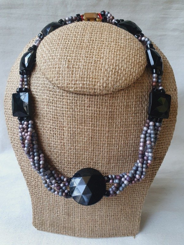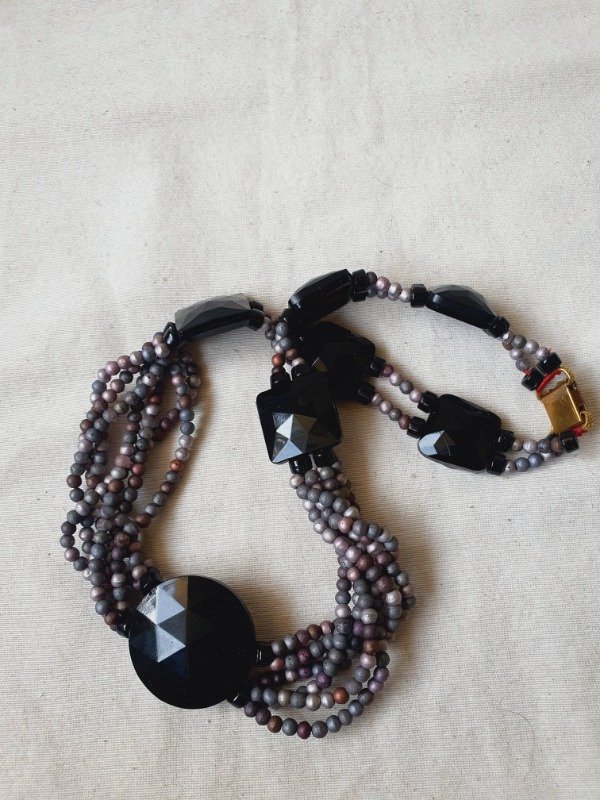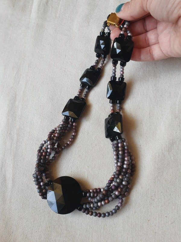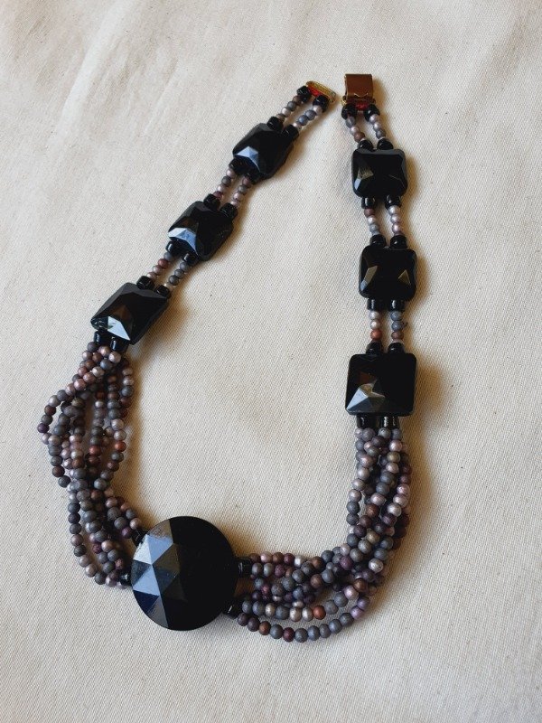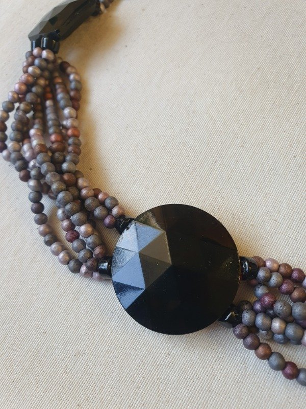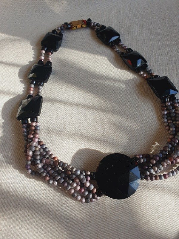 Collar de los años 30s, de cuentas geométricas en cristal Vauxhall con facetas y efecto espejado y torzadas de microcuentas de madera en tonos pastel (rosados, gris, salmón). En el centro tiene una cuenta circular y, con las torzadas, varias cuadradas y achatadas. Una maravilla tanto el diseño como la confección, las cuentas están hilvanadas en hilo de seda. Mide 54 cm y cierra con broche a presión