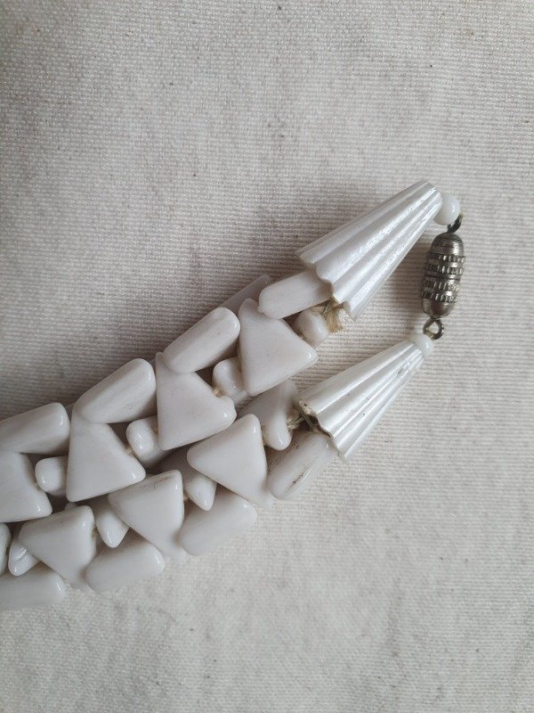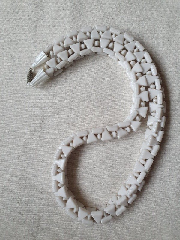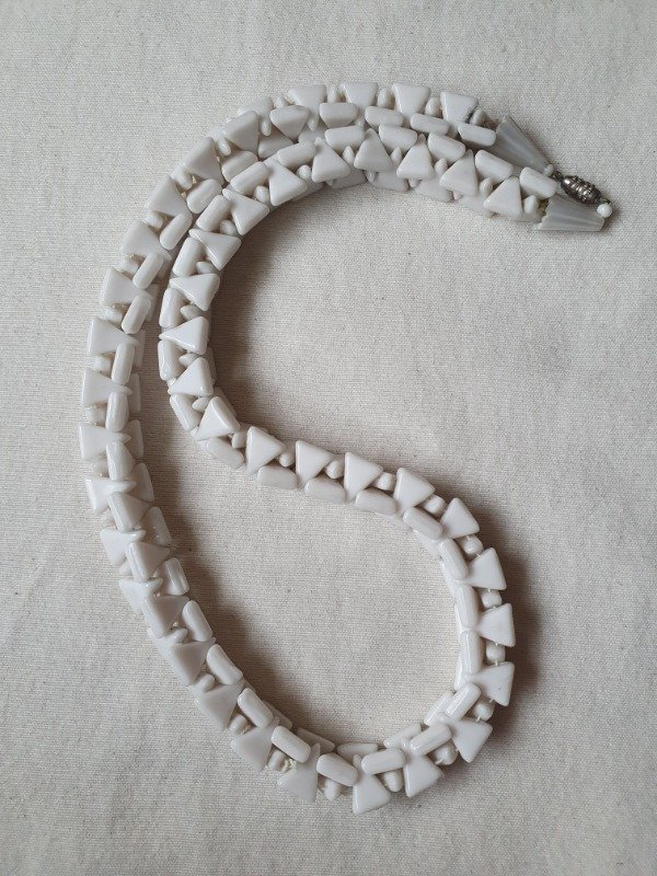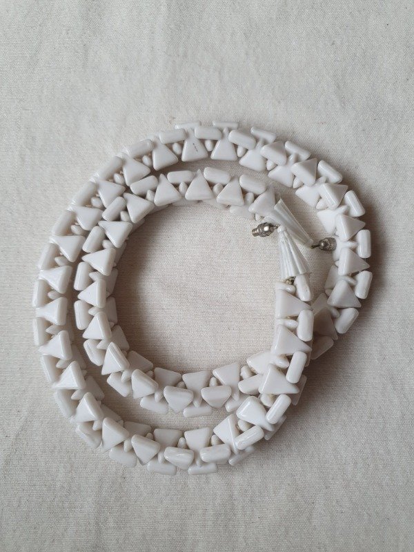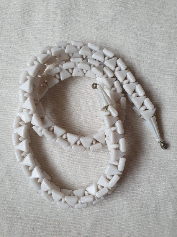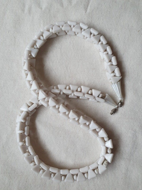 Sus cuentas son de opalina blanca o milk glass, triangulares y tienen doble perforación. Está enhebrado sobre cuatro columnas de hilo de seda y las cuentas encastran de una manera muy especial. Generan una estructura alargada de cuatro lados y apariencia de serpiente. Maravillas que sólo se veían hace casi 100 años.
