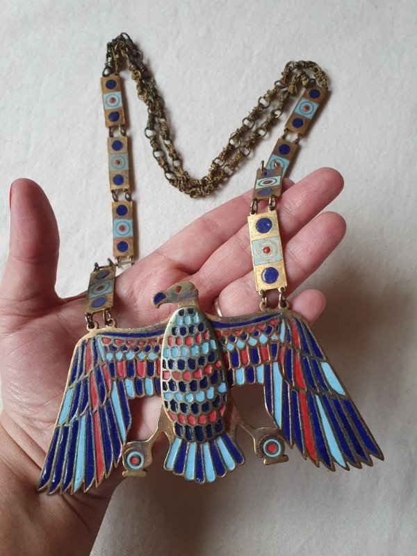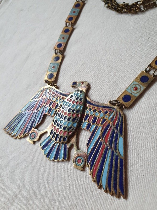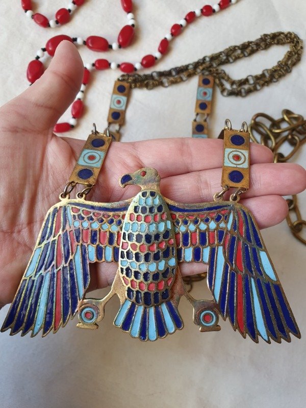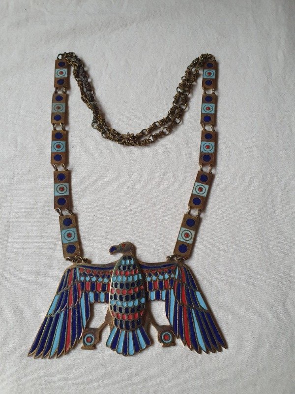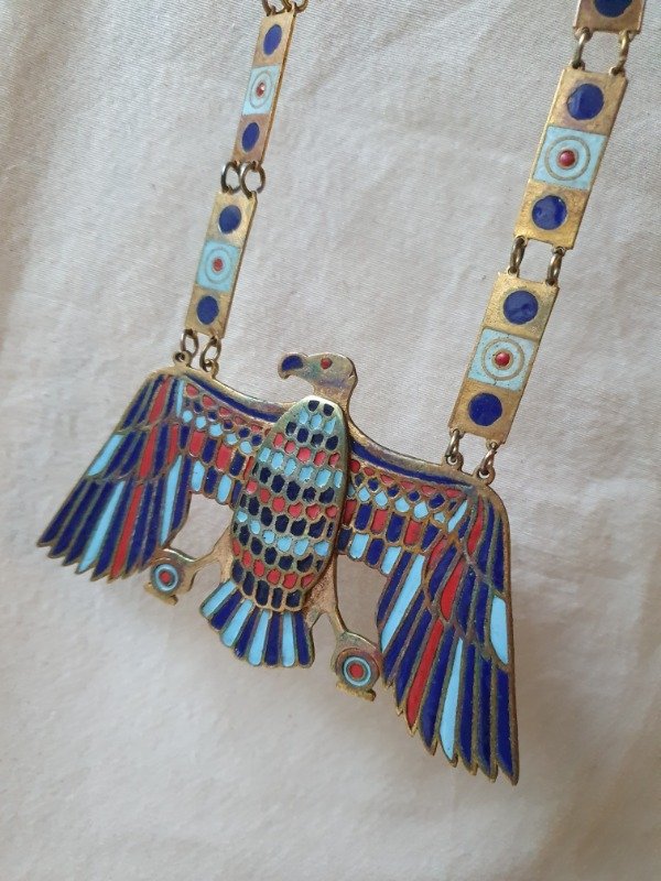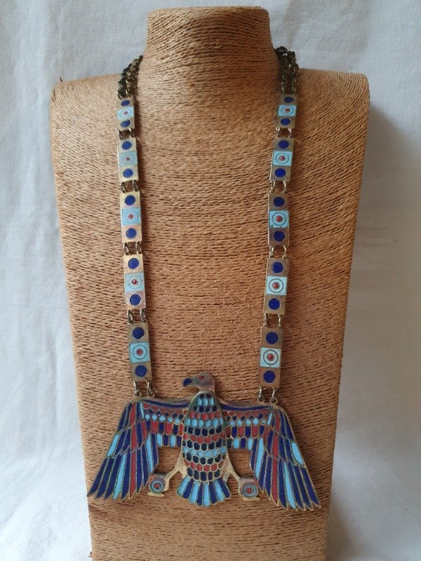 Collar reproducción de la diosa Nekhbet del Museo de El Cairo. Plaqueta de bronce con esmalte azul, tirquesa y rojo con forma de buitre. El diseño con esmalte y rectángulos con patrones geométricos es característico de las piezas inspiradas en el arte egipcio antiguo, y el uso de una doble cadena con eslabones rectangulares decorados refuerza el estilo vintage del collar. El original es una joya hallada en la tumba de Tutankamón. Hay muy pocas piezas en el mundo. Muy raro. El valor intl. oscila entre 900 y 1200 dls.