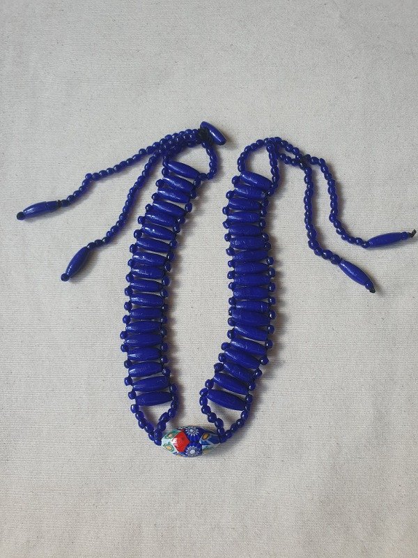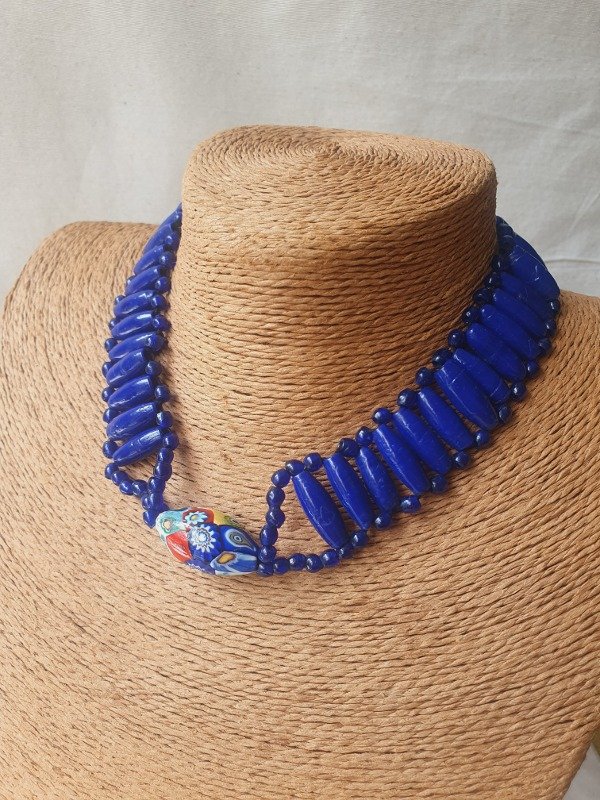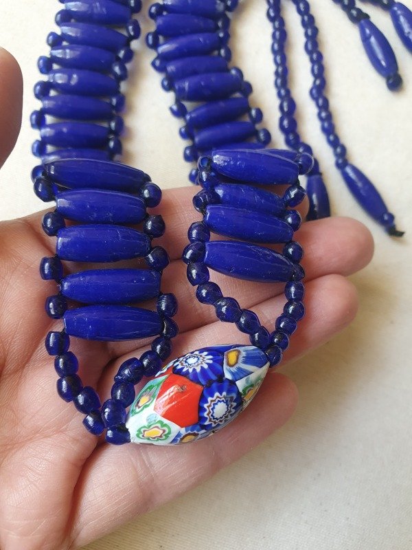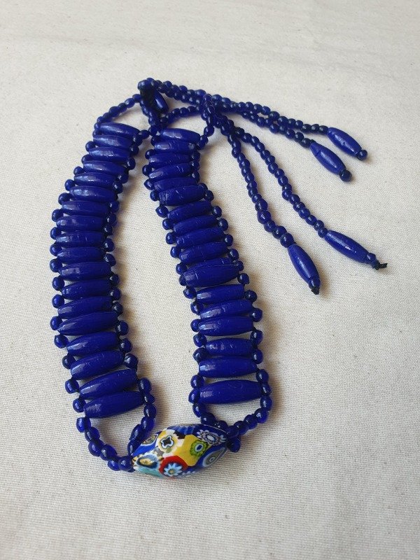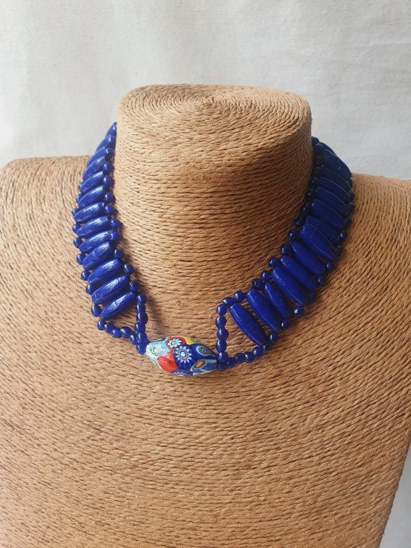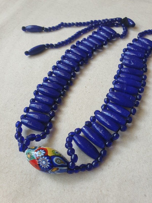 Choker años 20s~30s Art Déco de cuentas de opalina alargadas en tono azul intenso, dispuestas en forma perpendicular. En el centro tiene una cuenta oval de millefiori italiano multicolor. Abrocha con ojal y cuenta que traba y tiene 4 lazos colgantes que caen sobre la espalda.