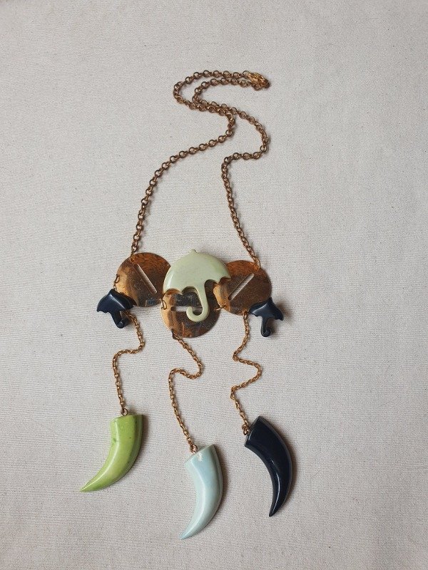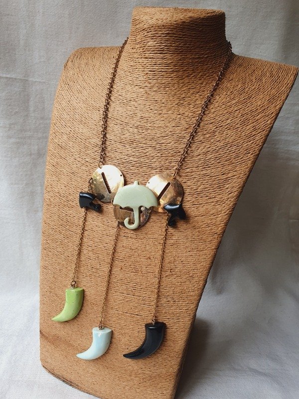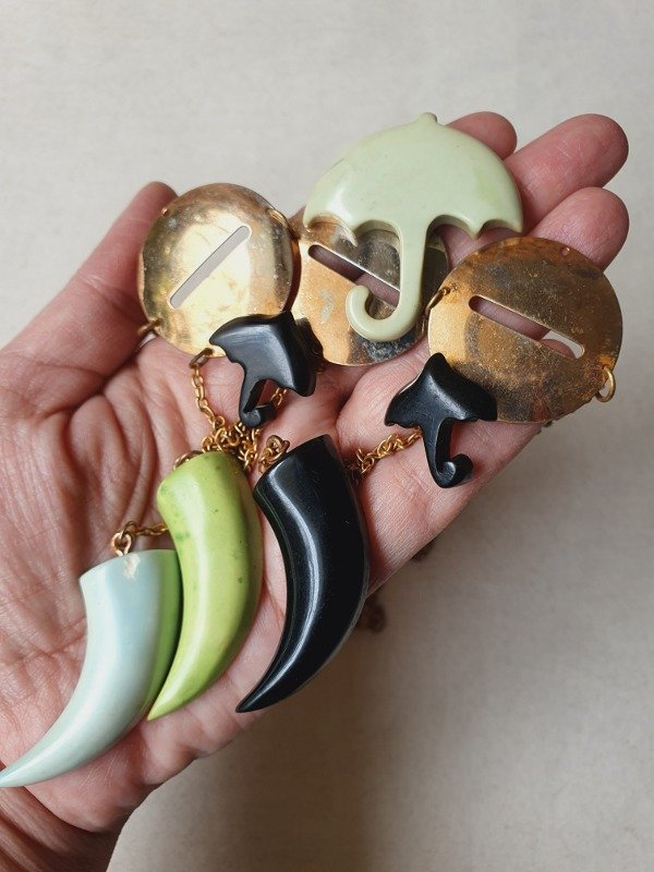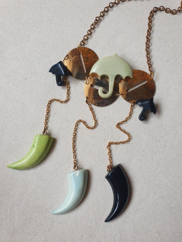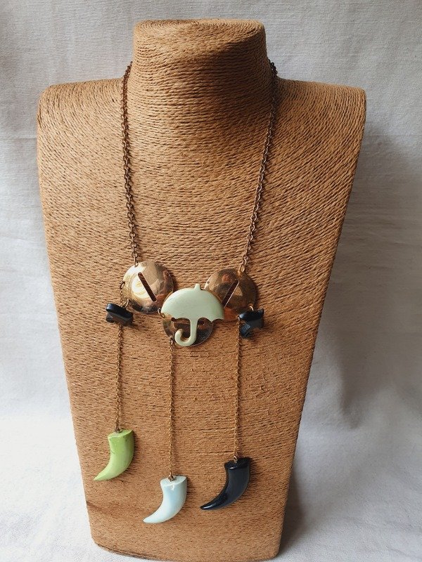 Tiene como adorno unas placas circulares desde las que cuelgan paragüitas en color verde agua y negro y, a su vez, tres largos colgantes con cuernitos de baquelita coloreada en dos tonos de verde y negro.