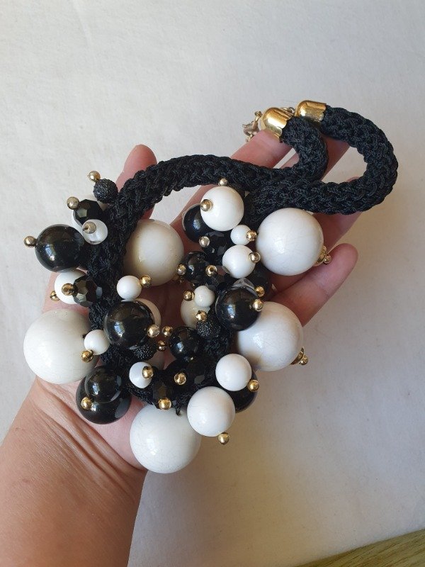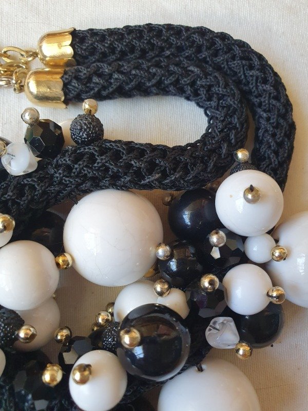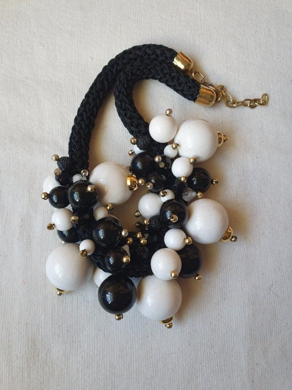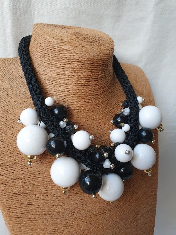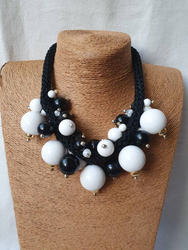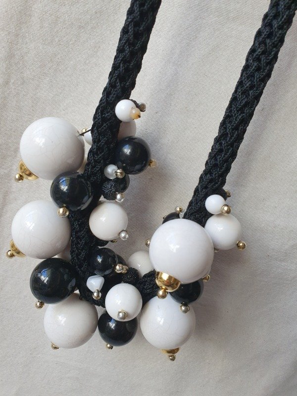 Collar 90s de cordón trenzado negro y borlas colgantes oversized en blanco y negro, combinadas con cuentas de diversas formas y texturas en los mismos tonos