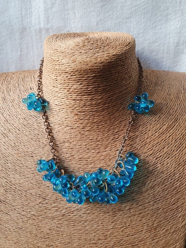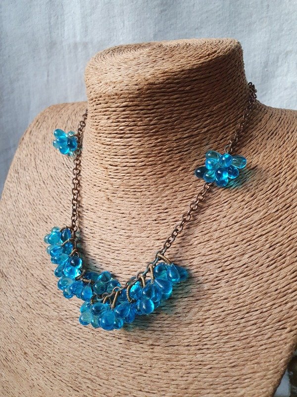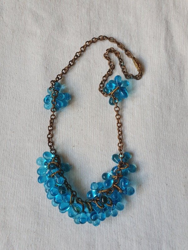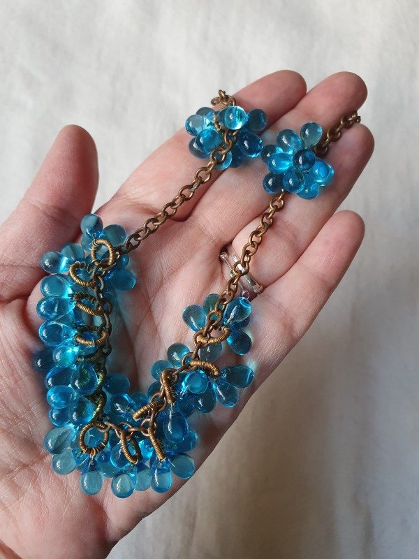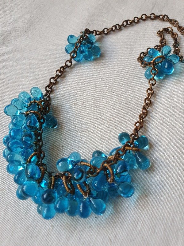 Collarcito de los años 30s Art Déco de cadena dorada de bronce adornada por decenas de gotitas de cristal a la flama hechas a mano en tono turquesa intenso.