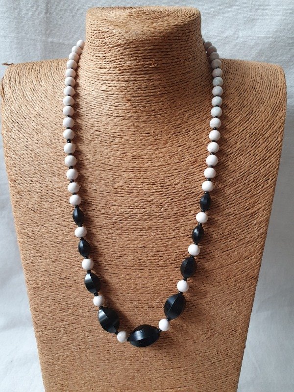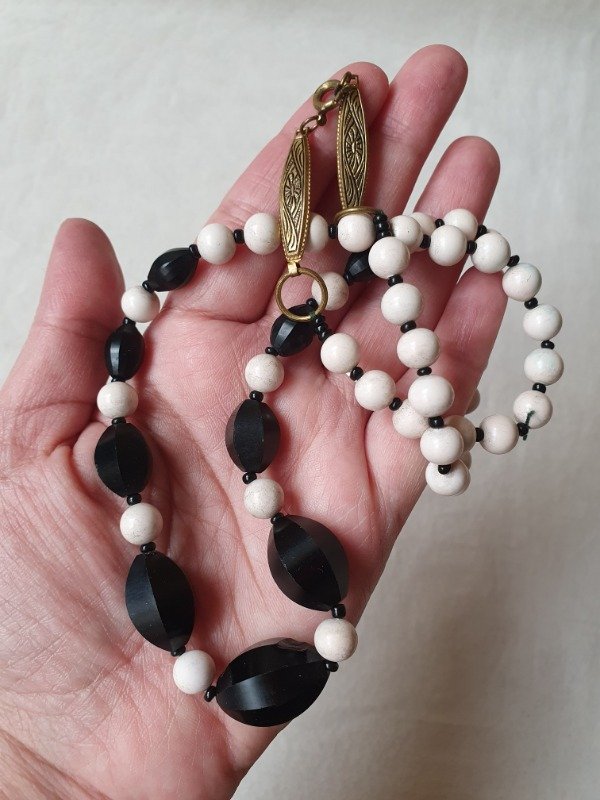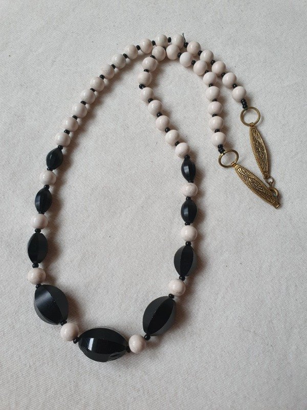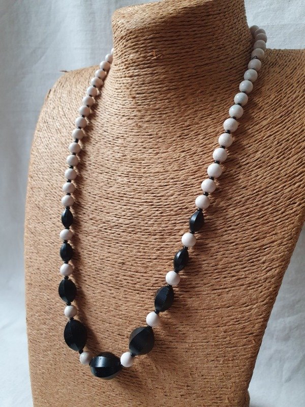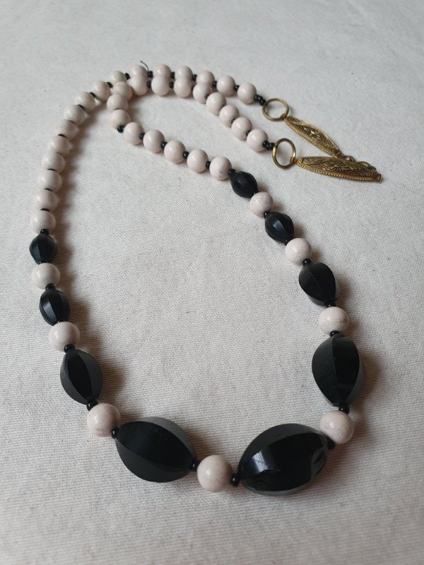 Collar de los años 20s que combina cuentas ovaladas de azabache mate facetadas con perlas de opalina blanca.