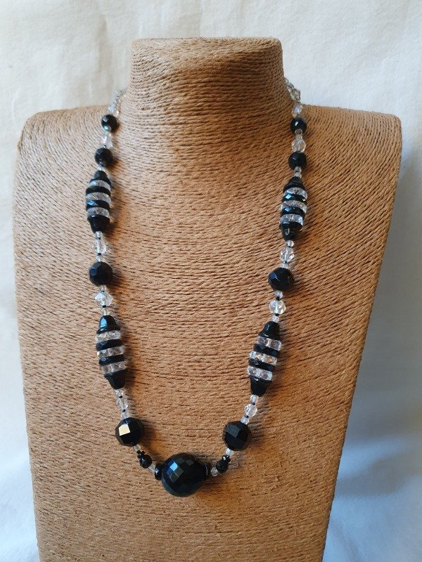 Combina cuentas cilíndricas y chatas ultrafacetadas transparentes y negras, formando un diseño escultural.