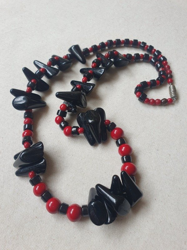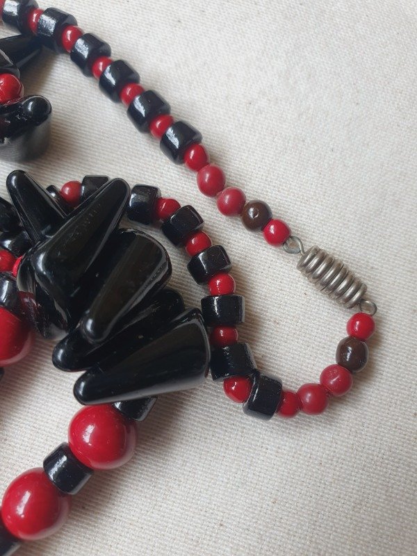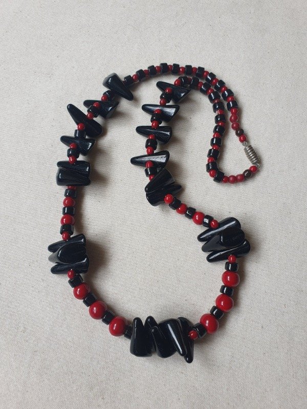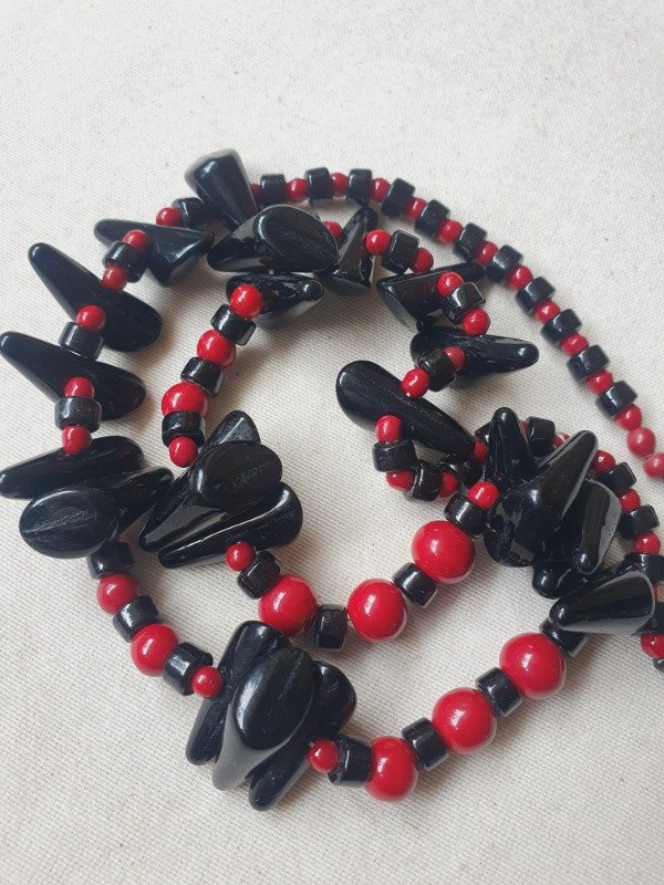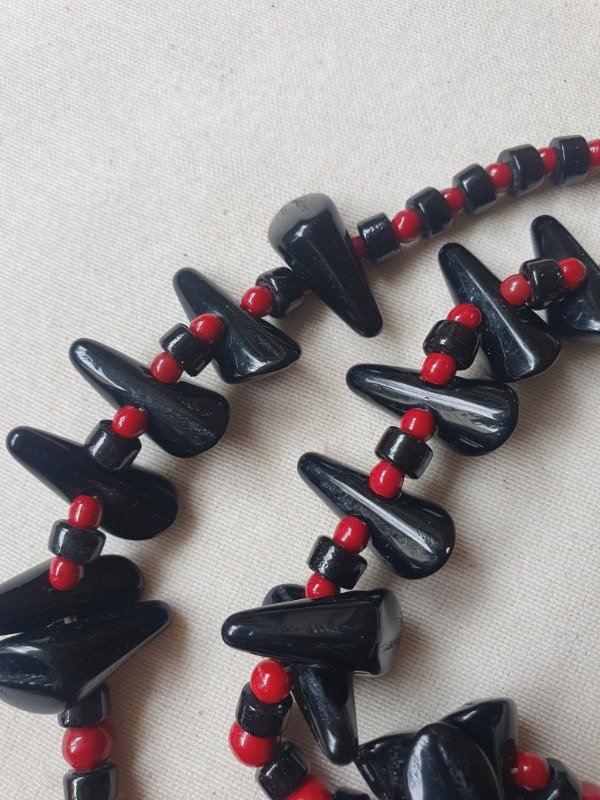 Las cuentas son perlas rojas intercaladas con "conos" o colmillos negros ultra brillantes.