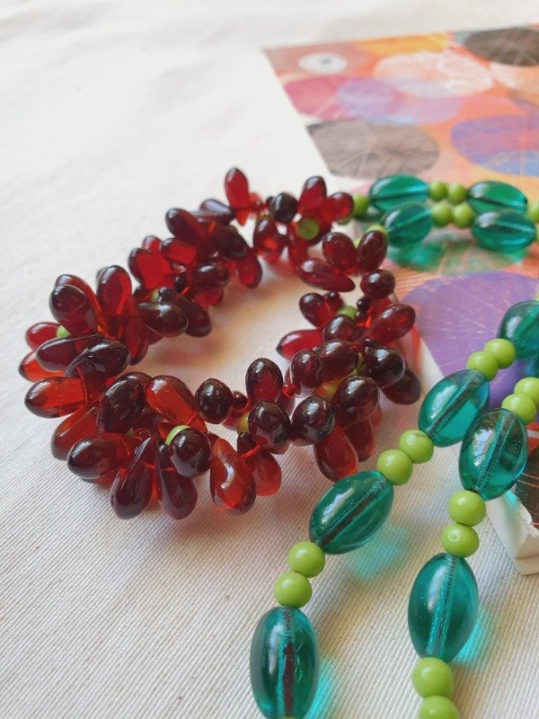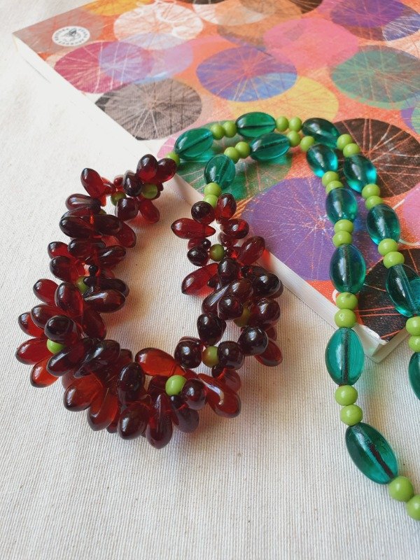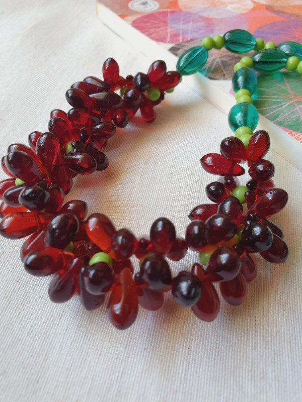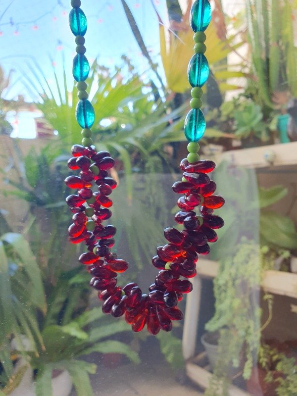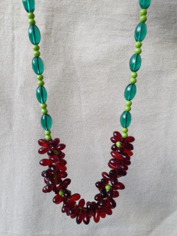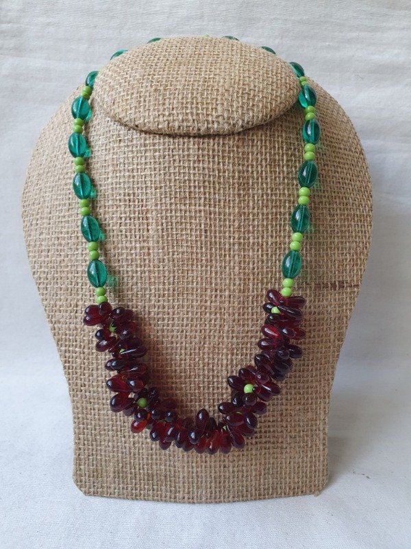 Collar Art Déco de los años 20s-30s realizado con gotitas de cristal color granate y cuentas ovaladas con gajos verde esmeralda. El diseño tiene un cluster central trenzado con opalinas verdes, ideal para que se luzcan las gotitas de cristal checo ultra brillante y transparente del color del granate. Mide 55 cm de longitud y cierra con broche mosquetón de la época