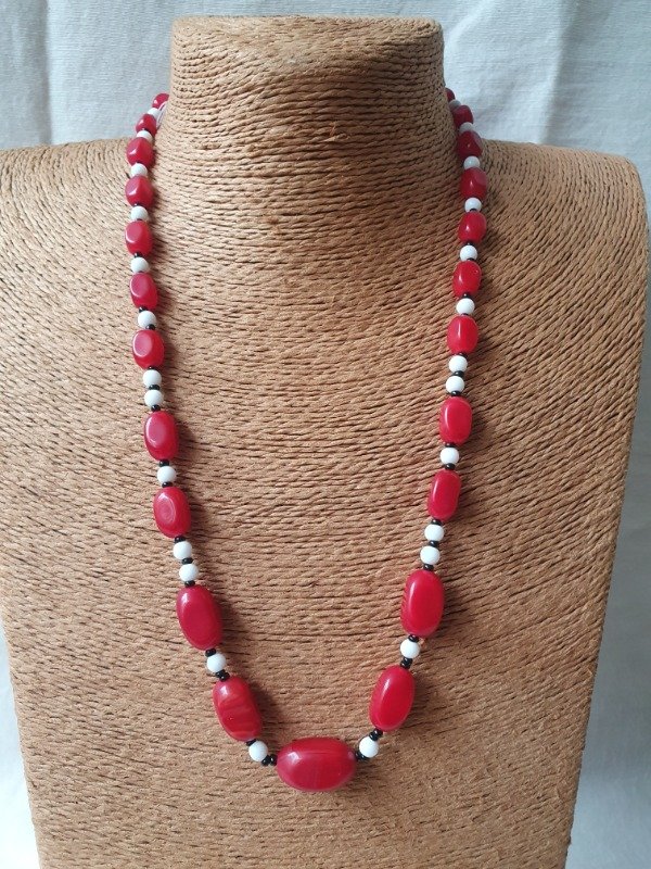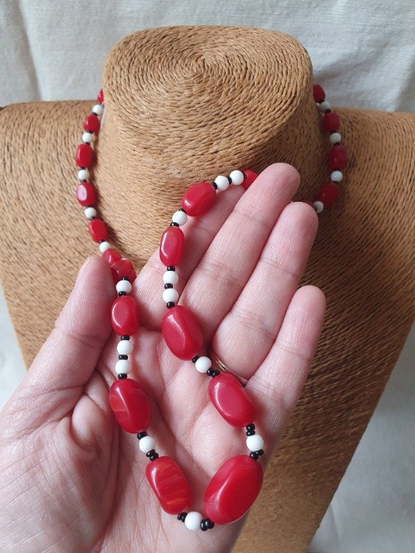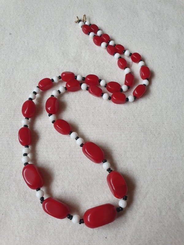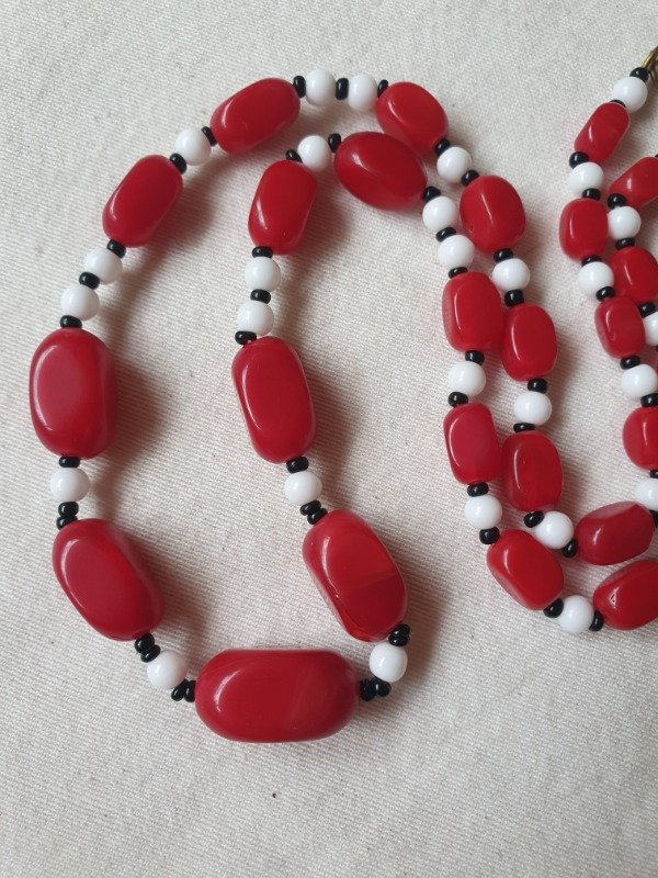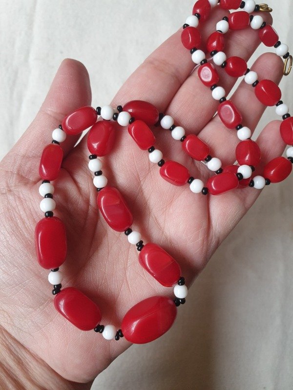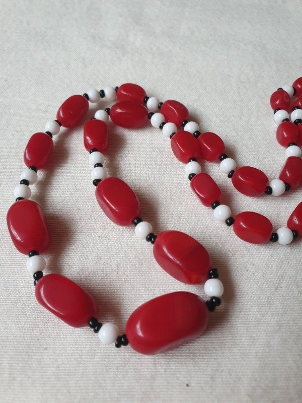 Collar Art Déco 30s-40s de cuentas de opalina ovaladas y achatadas color rojo, combinadas con cuentas blancas y negras que recrean un patrón similar a la serpiente coral. Mide 55 cm de longitud.
