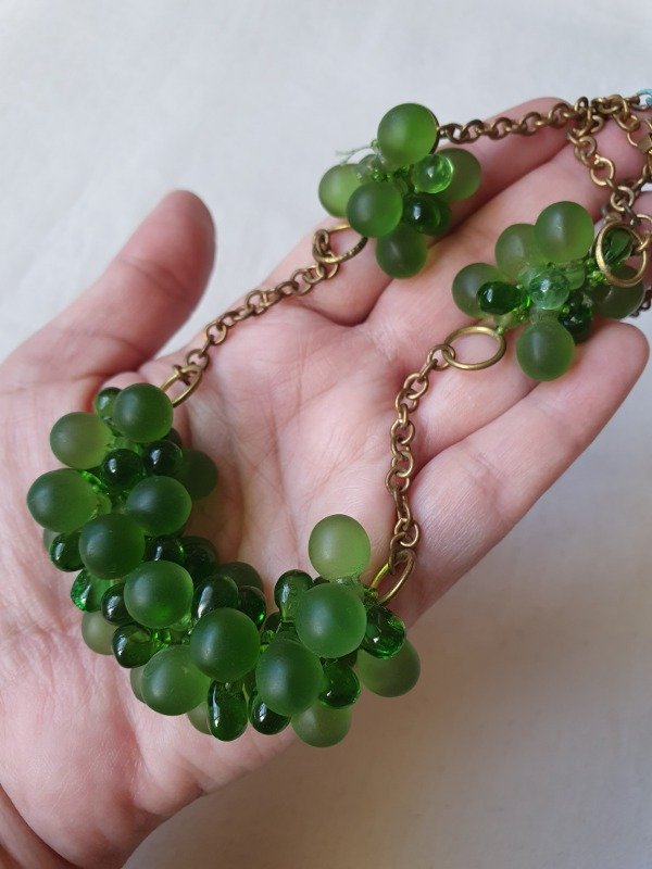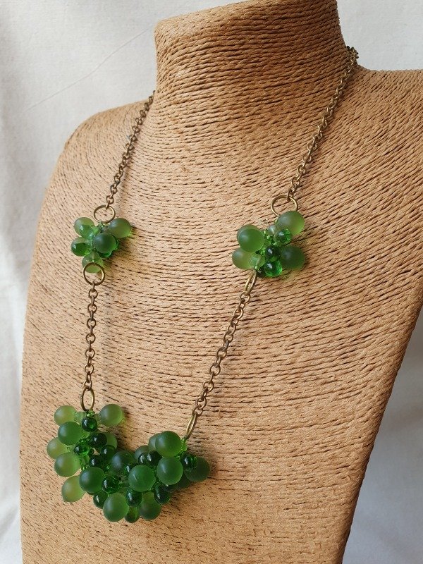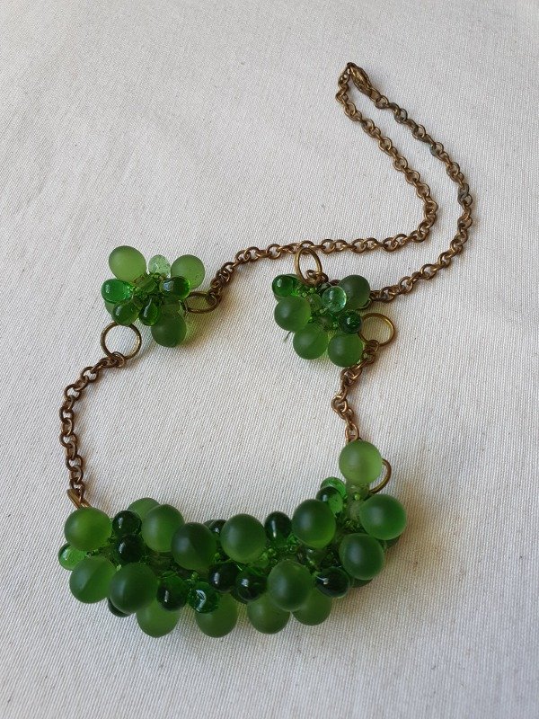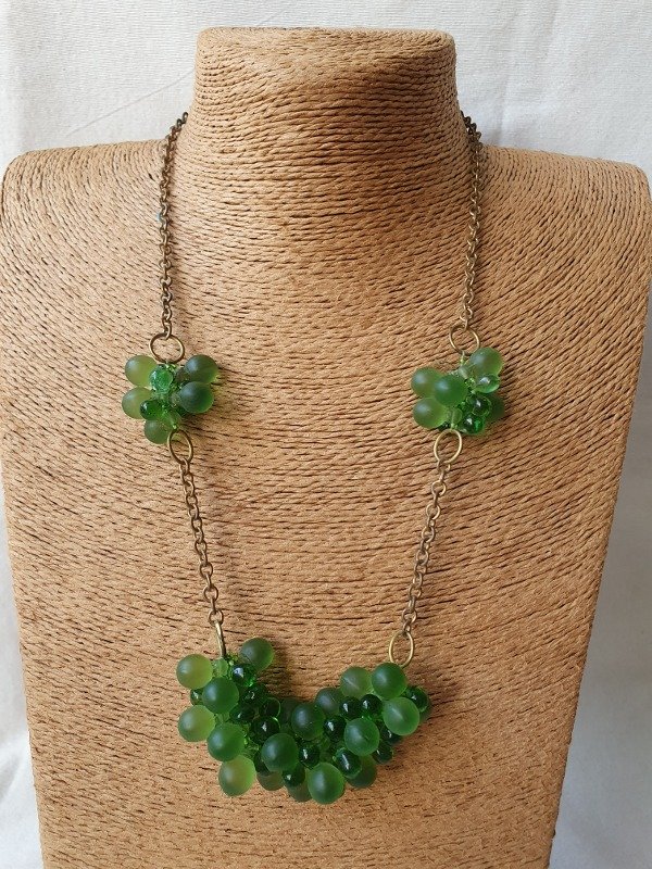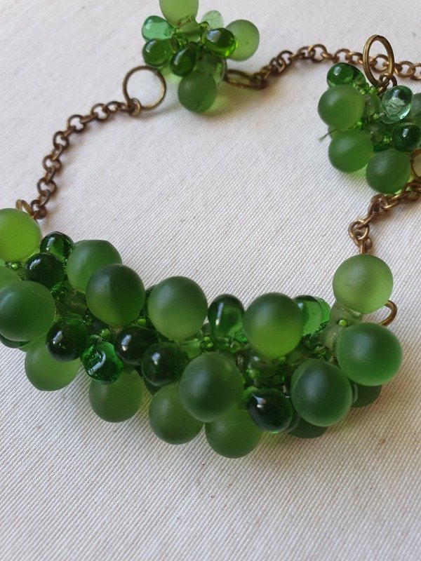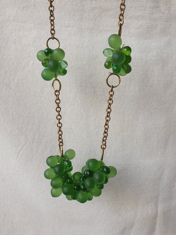 Collarcito de los años 30s Art Déco de cadena dorada de bronce adornada por decenas de gotitas de cristal a la flama hechas a mano en tonos verdes esmerilados y cristalinos. Tien3 un gran cluster central y dos pequeños.