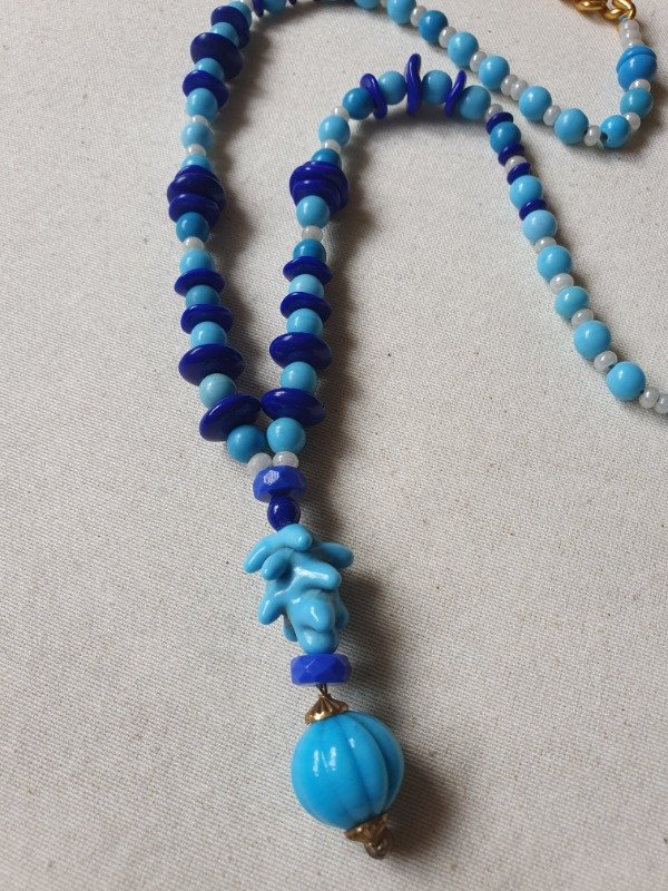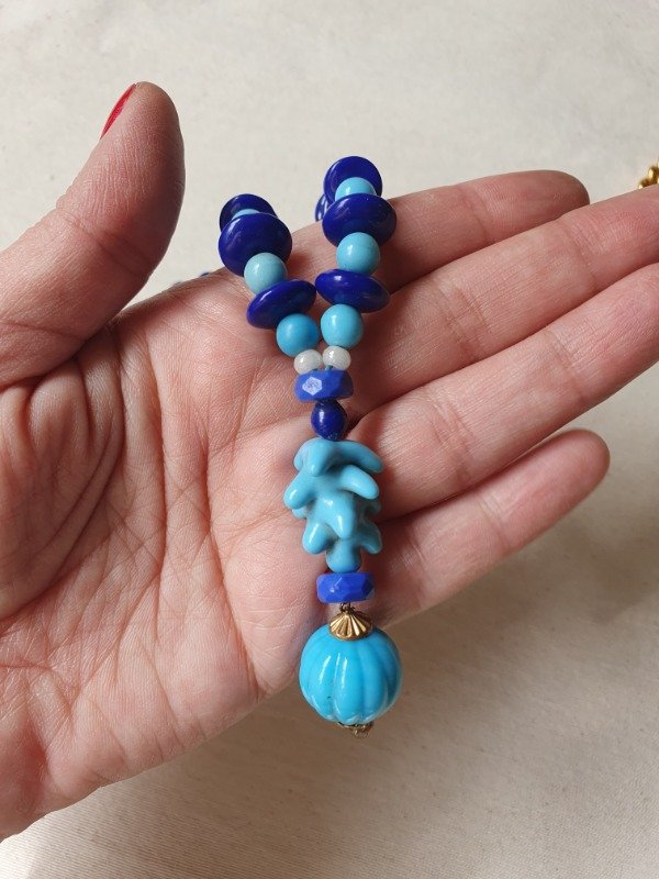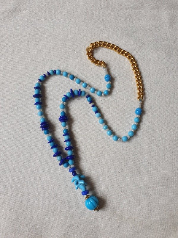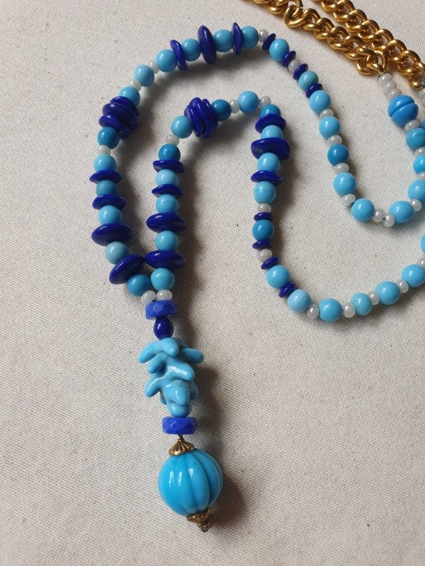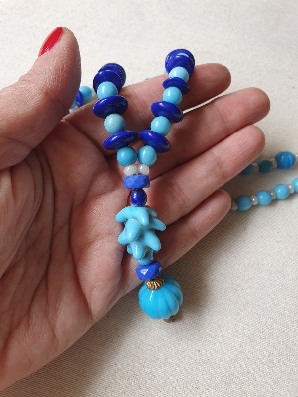 Collar “Criaturas submarinas” modelo lariat de opalina y cristales en tonos turquesa, azul y perlas de los años 30s. Termina en una borla melón y una pieza de cristal ondulada maravillosa y rara. Mide 66 cm de longitud + 6 cm de la borla