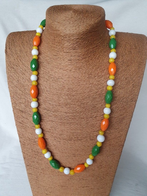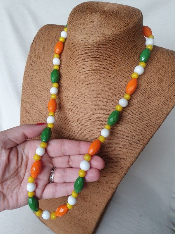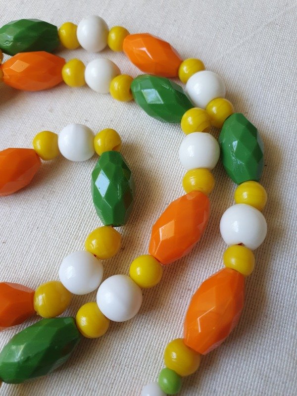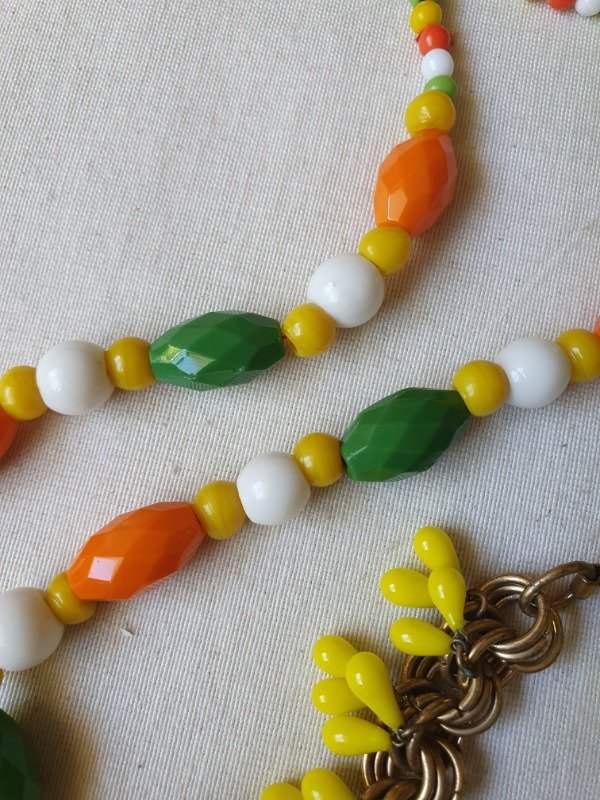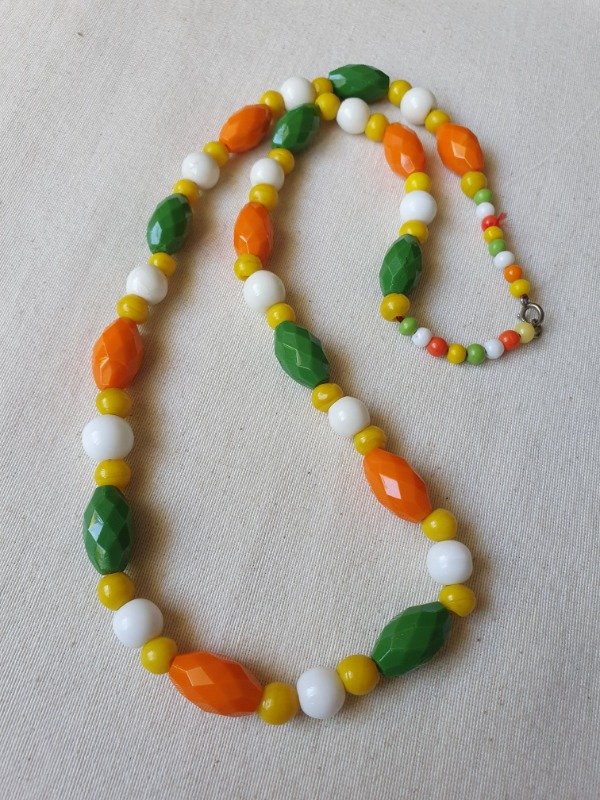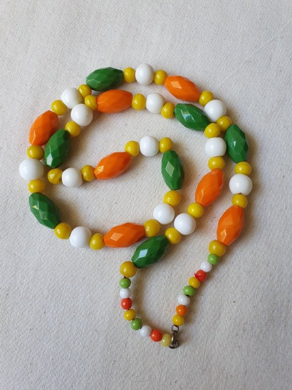 Collar Art Déco de los años 20s ~ 30s. Está realizado con una variedad de cuentas de cristal en tonos naranja, verde, amarillo y milk glass. Las cuentas ovales facetadas son una maravilla. Mide 60 cm