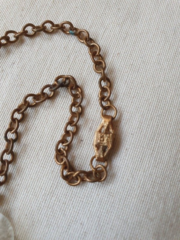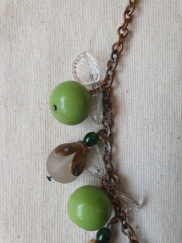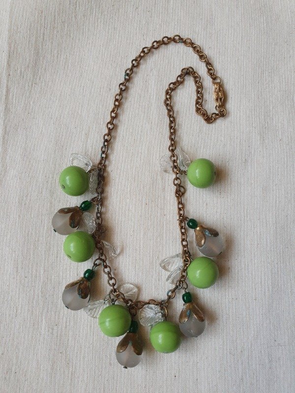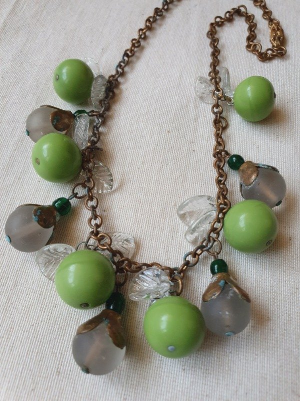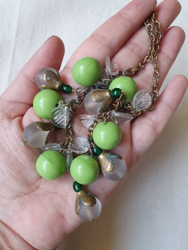 Collar Art Déco de los años 30s, de dijes, con hojitas de vidrio moldeado transparente y borlas de opalina verde y vidrio esmerilado. Los colgantes están suspendidos de una cadena dorada y tiene detalles preciosos de diseño, como las hojitas transparentes de vidrio y los pétalos que cubren las esferas. Mide 41 cm de longitud. Cierra con brochecito hook geométrico que es una maravilla.