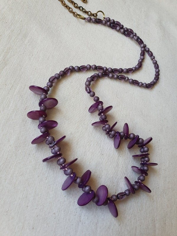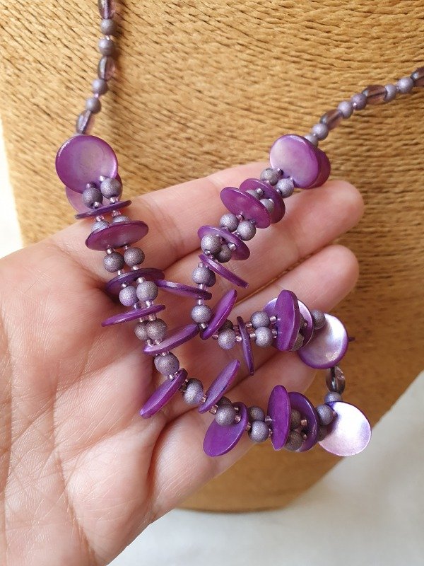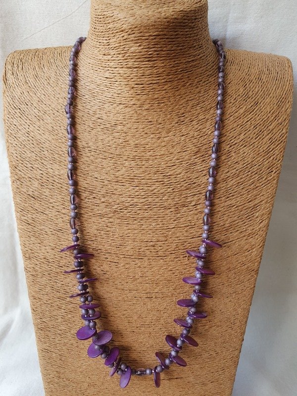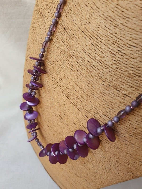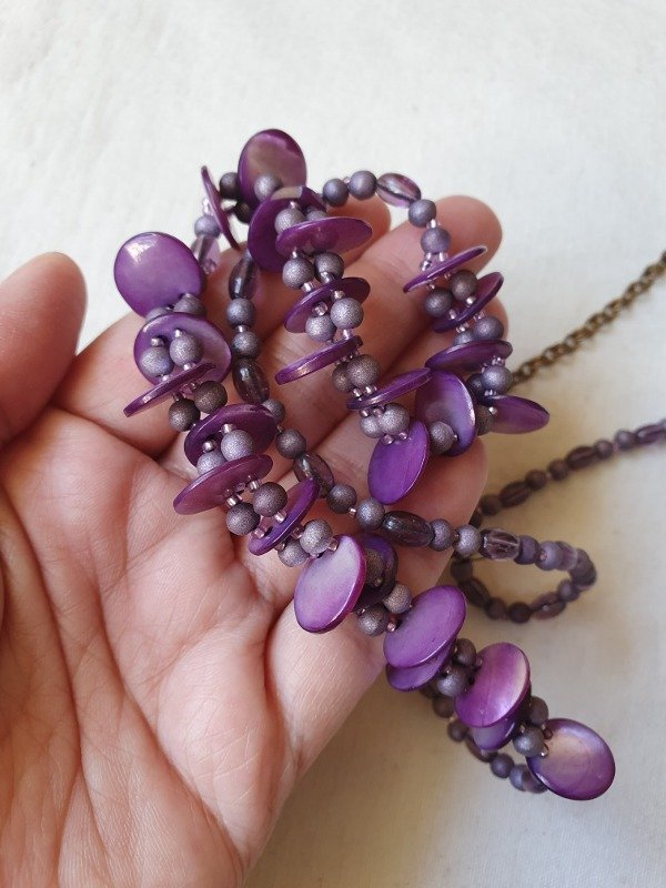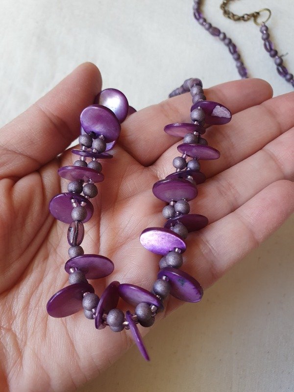 Collar Art Déco de los años 20s ~ 30s. Está realizado con una variedad de cuentas en forma de discos de nácar coloreado en violáceo, perlitas de cristal pintadas en metalizado malva y cuentitss ovaladas del tono de las amatistas. El diseño es precioso, se abre en dos vueltas que se vuelven a unir en el centro. Mide 75 cm de longitud
