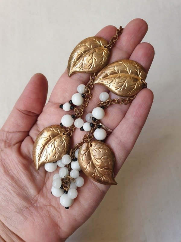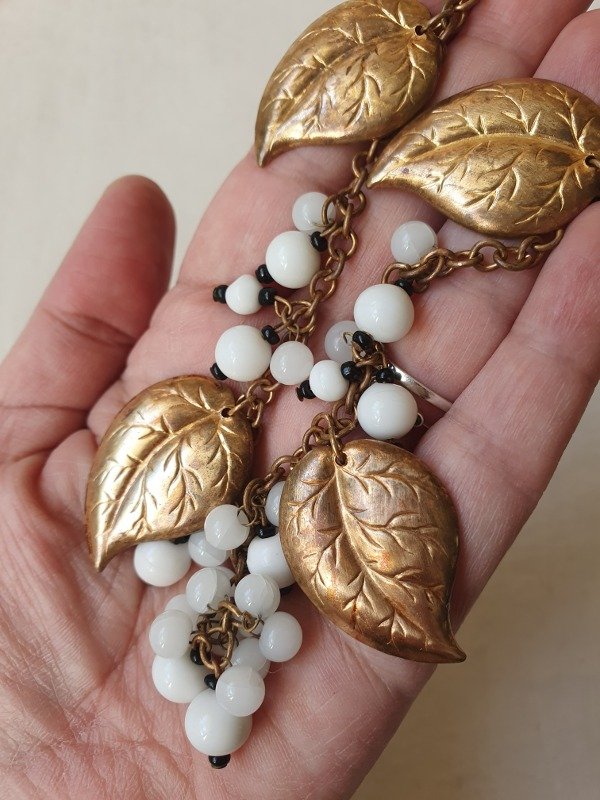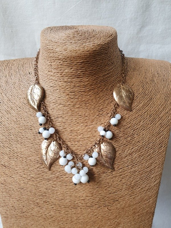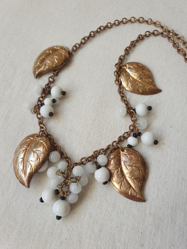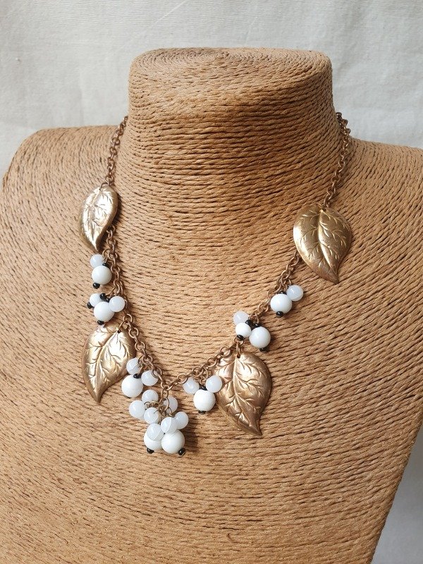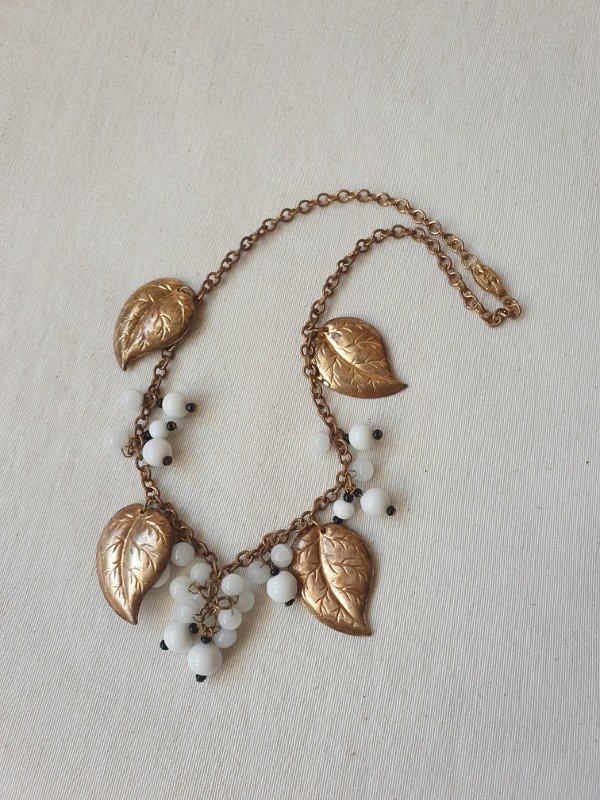 Collar Art Déco de los años 30s, de dijes, con hojitas doradas y cuentitas de opalina blanca y negra. Los colgantes están suspendidos de una cadena dorada y tiene detalles preciosos de diseño, como las hojitas. Las hojitas son de hoja de latón moldeado y ultra brillante. Mide 40 cm de longitud + 3 cm del racimo central. Cierra con un brochecito déco geométrico que es una maravilla.