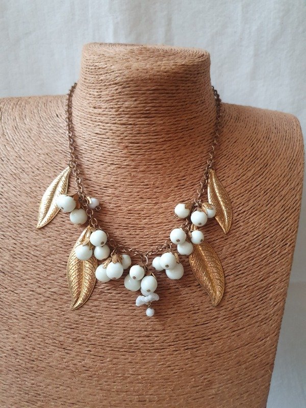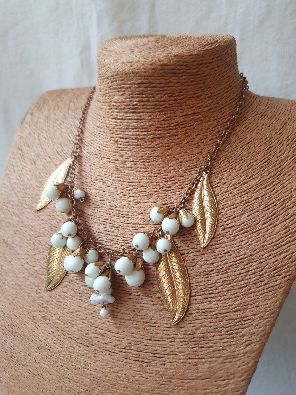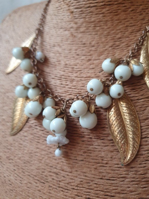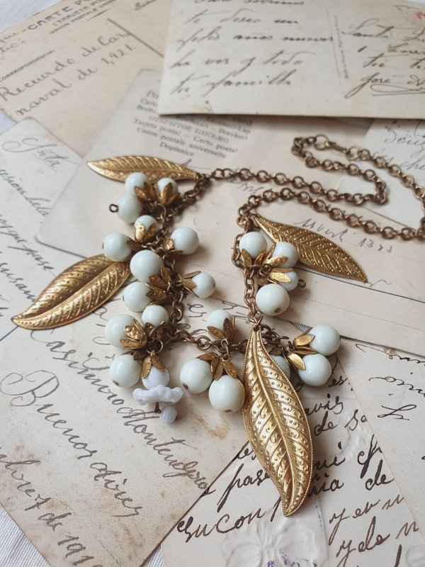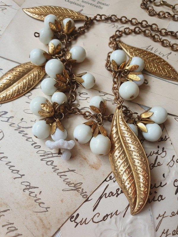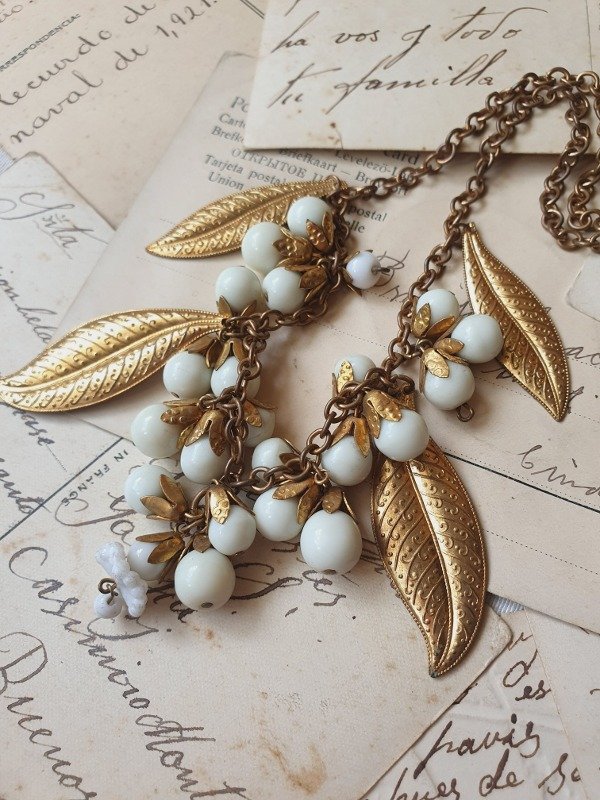 Collarcito Art Deco años 30s estilo fruit salad, con hojitas de oro ruso labradas y colgantes de cristal de urani0 que brillan en tonos fluo cuando se las expone a la luz UV (luz negra). Tiene cadena dorada y cierra con broche Déco con ganchito. Mide 42 cm.