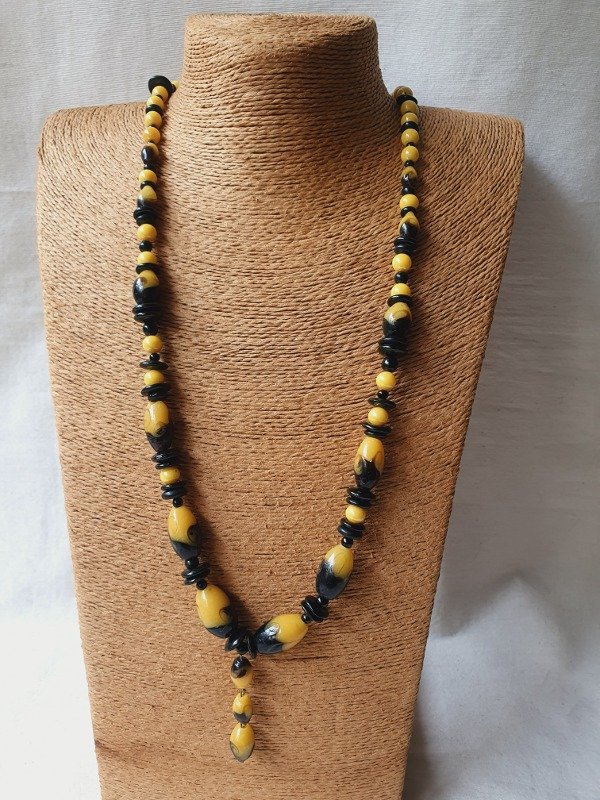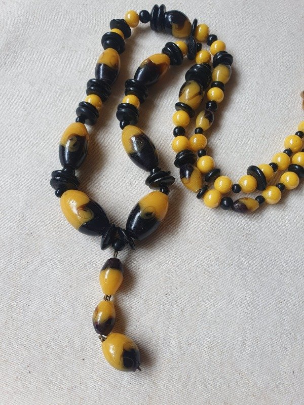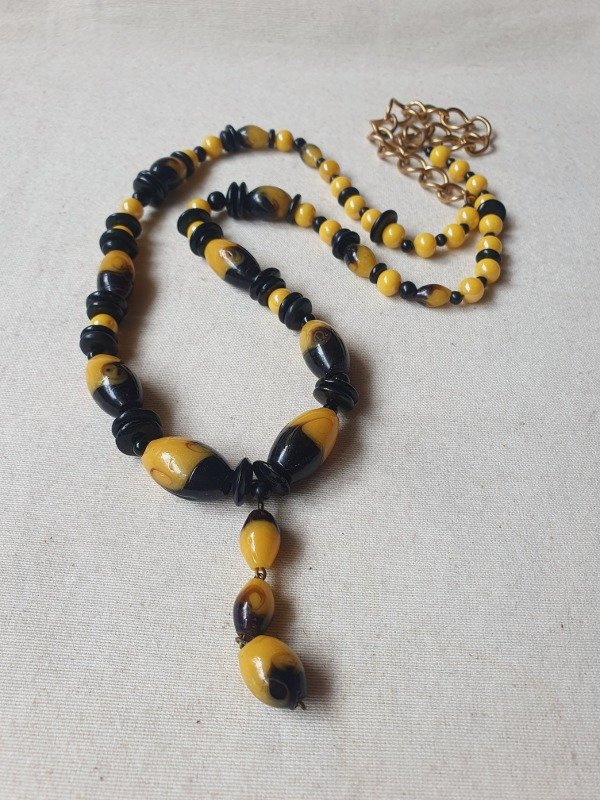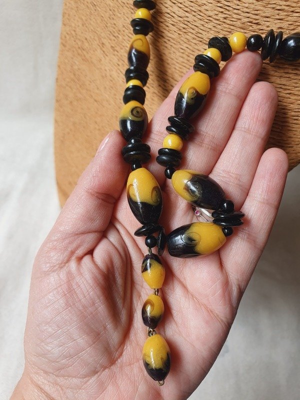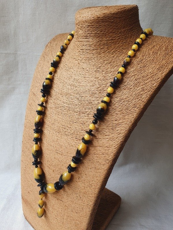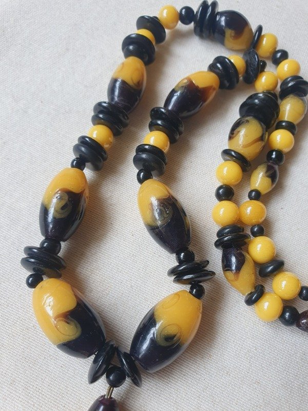 Está realizado con una variedad de cuentas de cristal lampwork en tonos miel y violeta intenso con diseño de volutas hechas a mano.