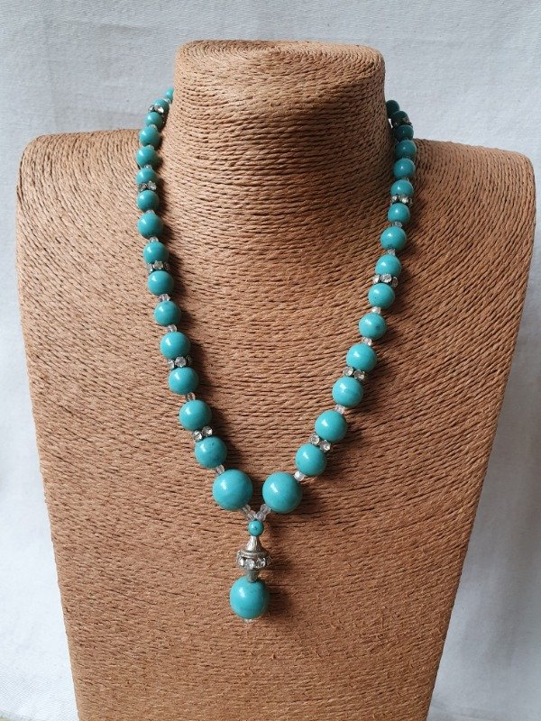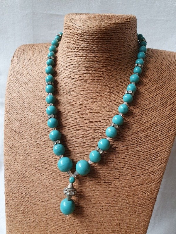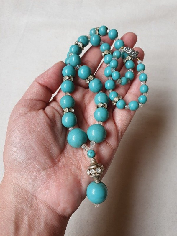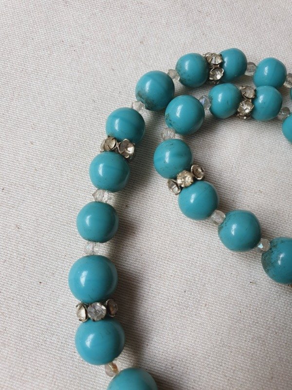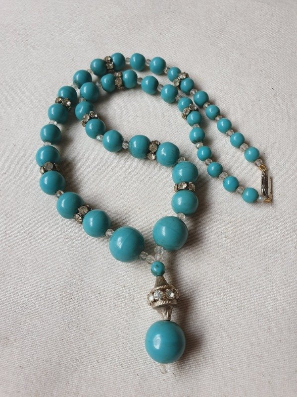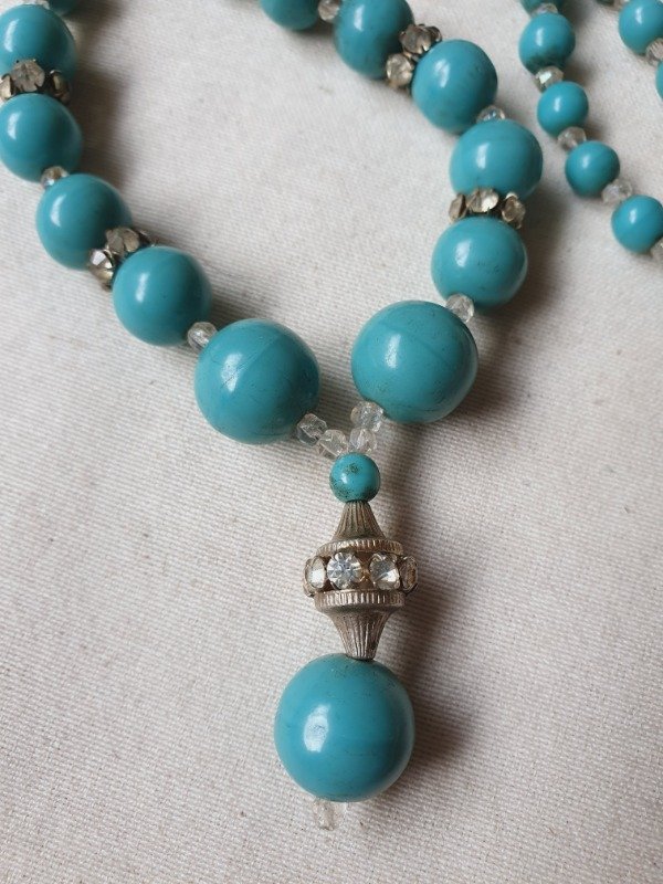 Collar Art Déco de los años 20s, modelo lariat, con terminación en borla colgante. Está realizado con una variedad de cuentas de opalina turquesa y tiene separadores de piedritas muy brillantes. Mide 50 cm + 3 cm de la terminación