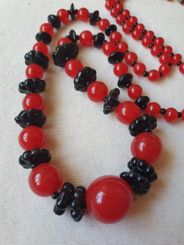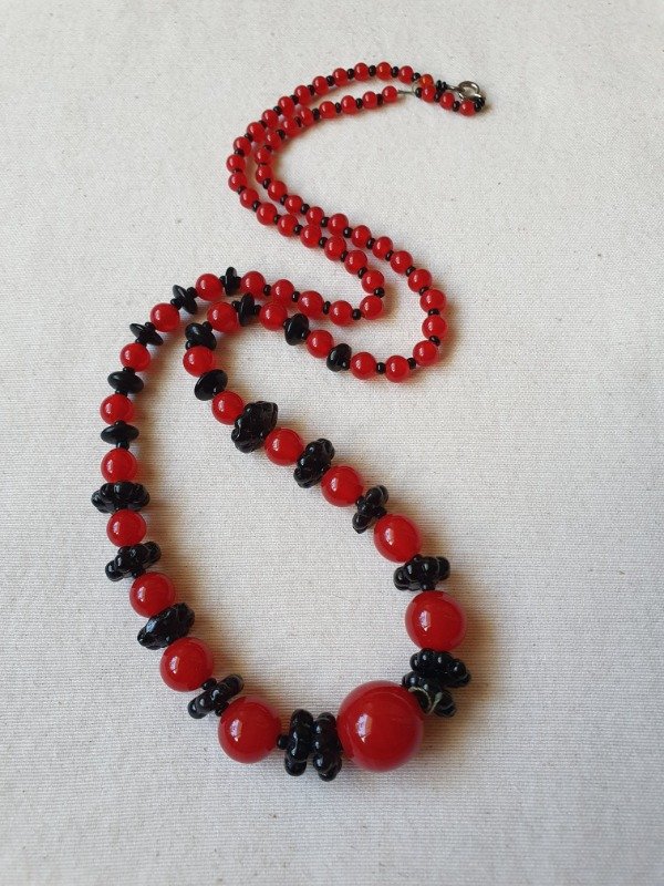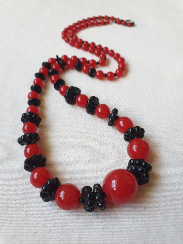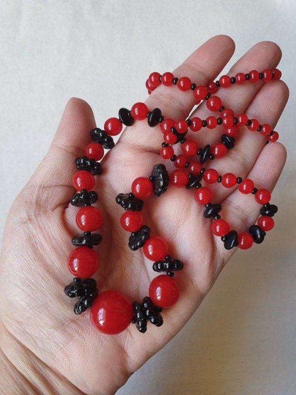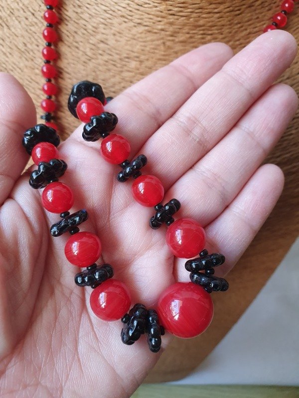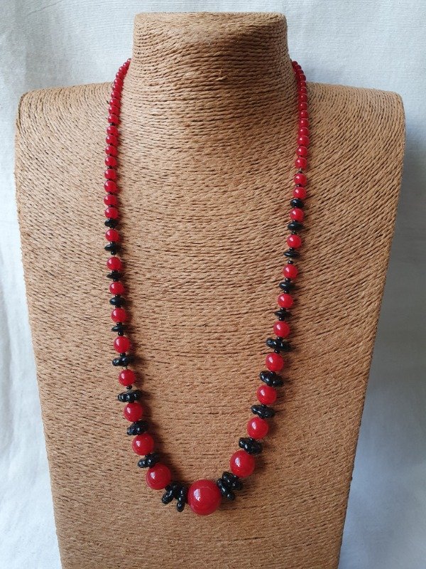 Collar Opalina Roja y Discos Cristal Negro con Onditas