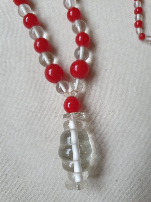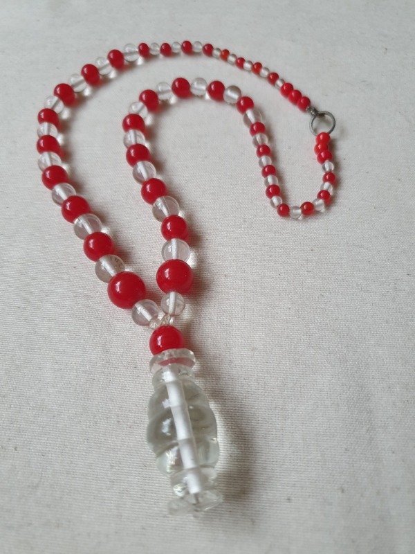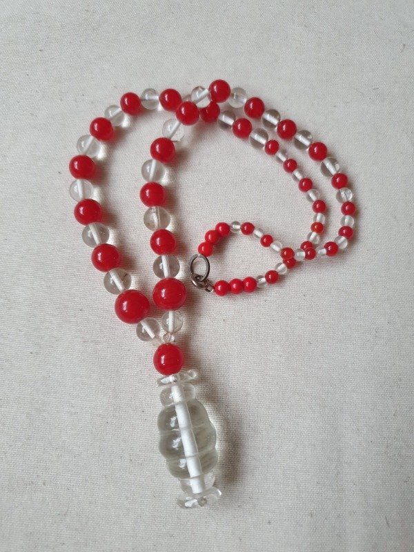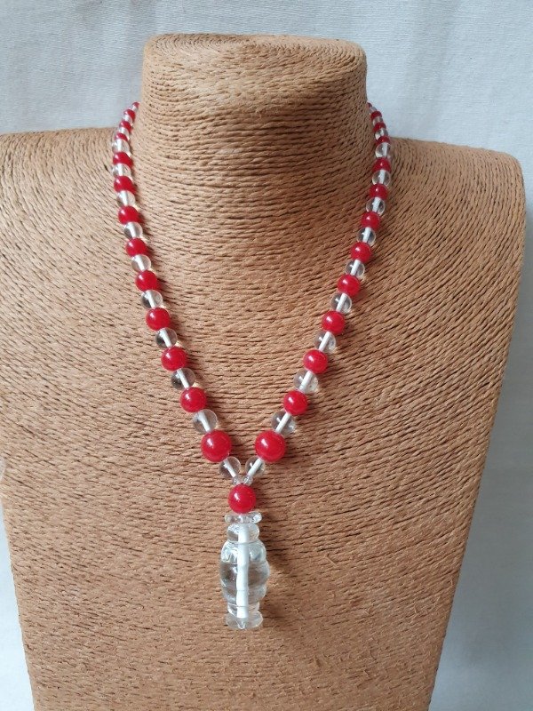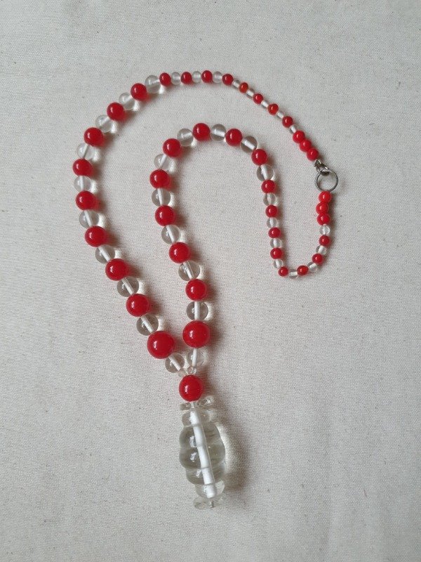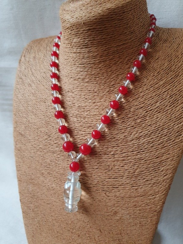 Está realizado con una variedad de cuentas de opalina color tomate y, a su vez, tiene separadores de cristales incoloros.