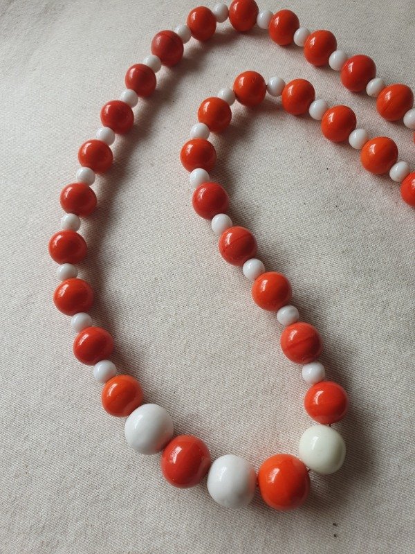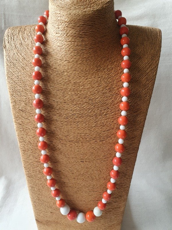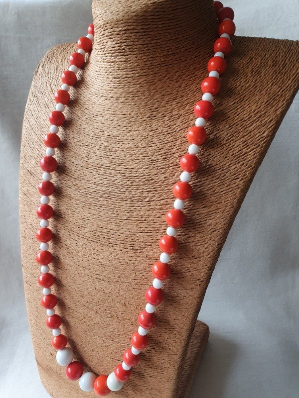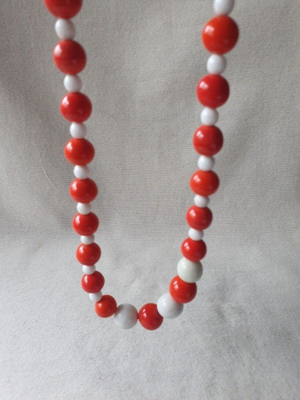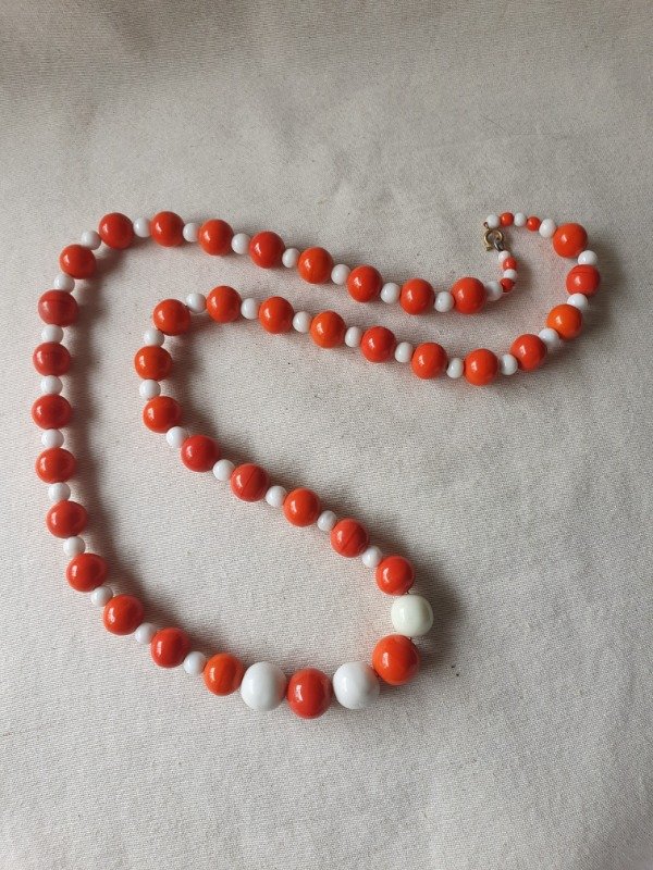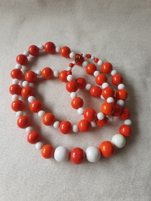 Collar Art Déco de los años 20s ~ 30s. Está realizado con una variedad de cuentas de cristal en tonos coral y milk glass. Mide 80 cm de longitud.