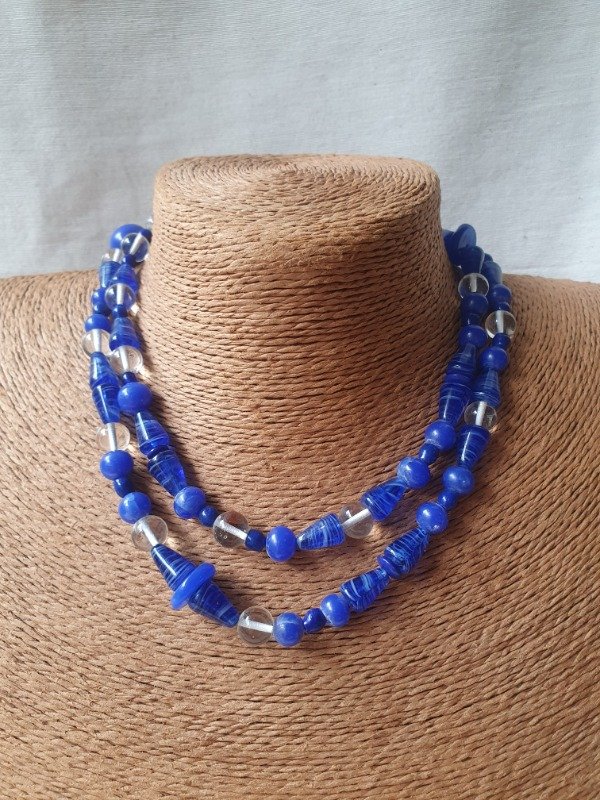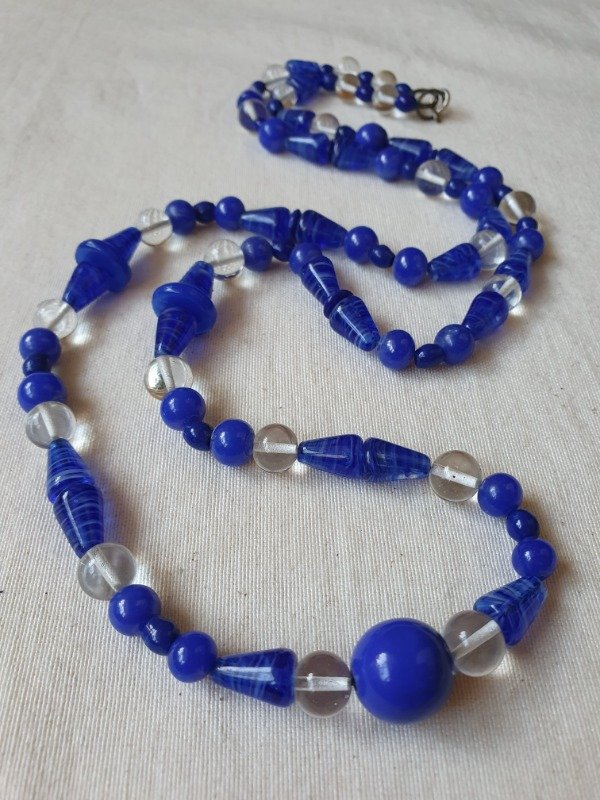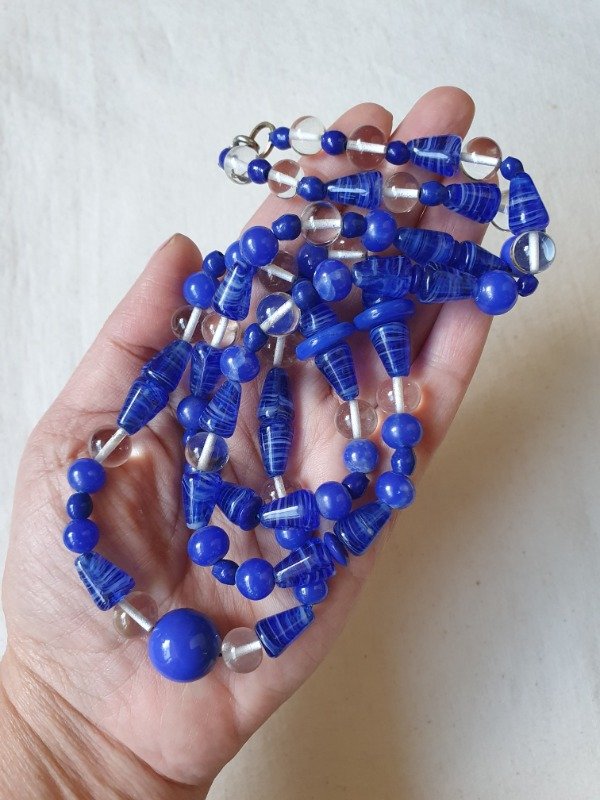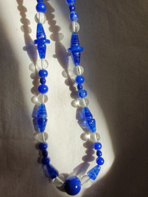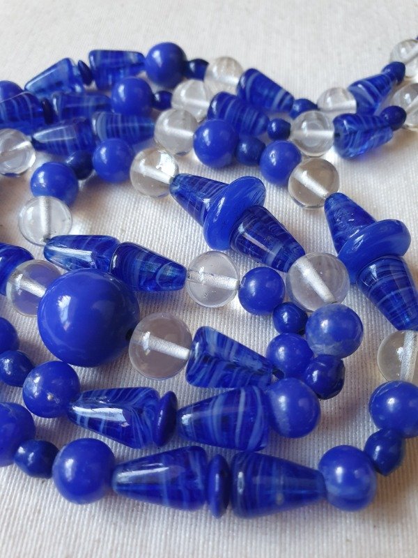 Collar Art Déco de los años 20s~30s. Sautoir (collar largo) realizado con una variedad de cuentas checas de cristales en diferentes tonos de azulados de porphyry glass y traslúcidas. Mide 85 cm y se pueden dar dos vueltas