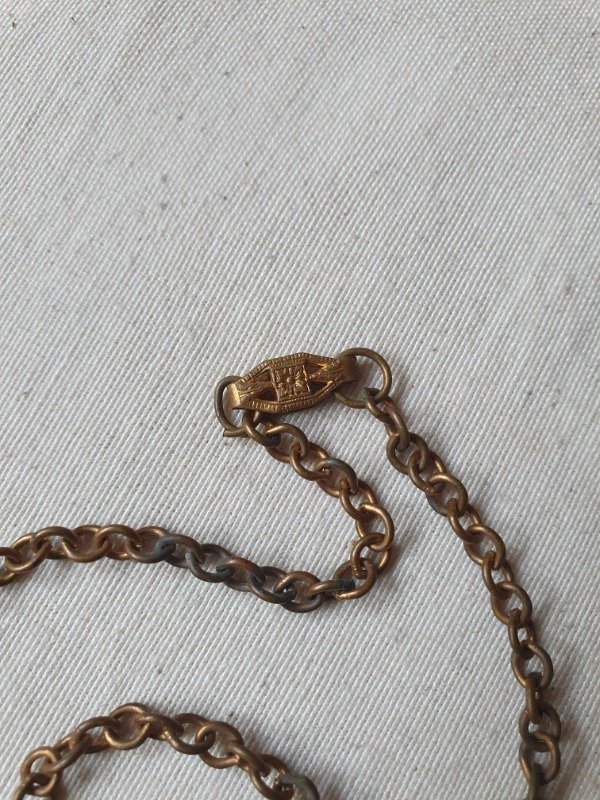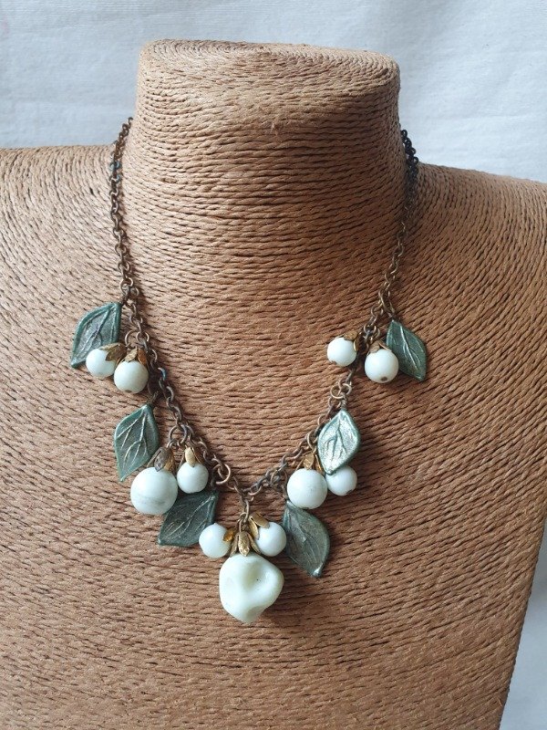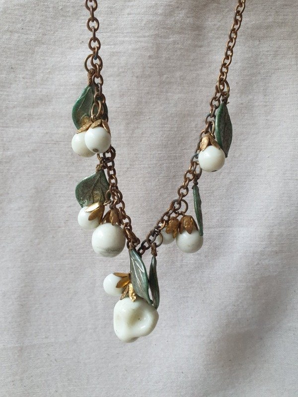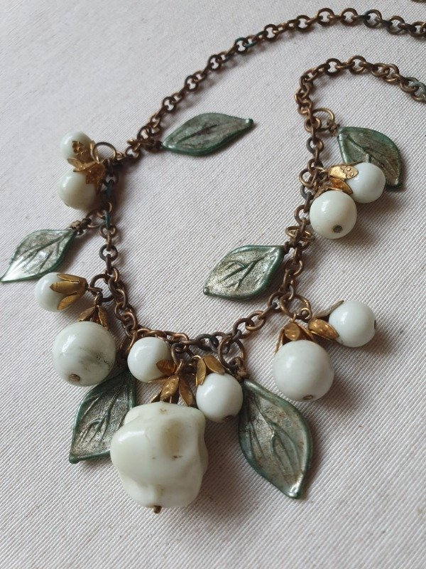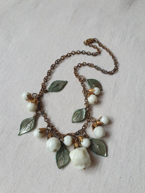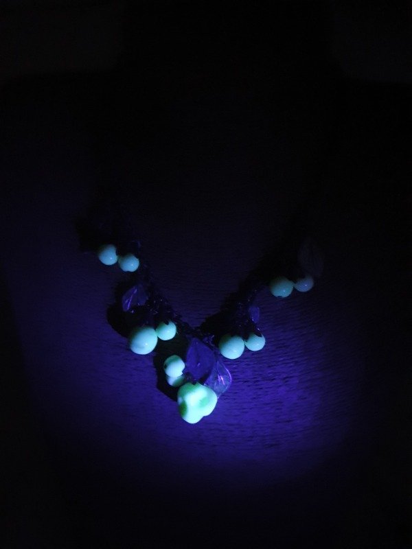 Collarcito Art Deco años 30s~40s estilo fruit salad, con hojitas de cristal verdes y colgantes de cristal de urani0 que brillan en tonos fluo cuando se las expone a la luz UV (luz negra). Tiene cadena dorada y cierra con broche Déco con ganchito. Mide 40 cm.