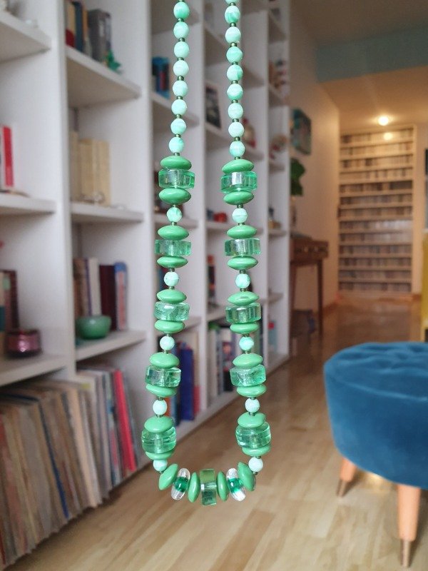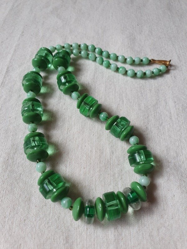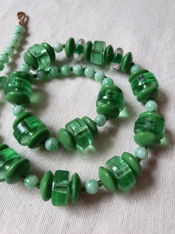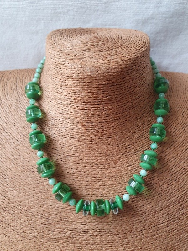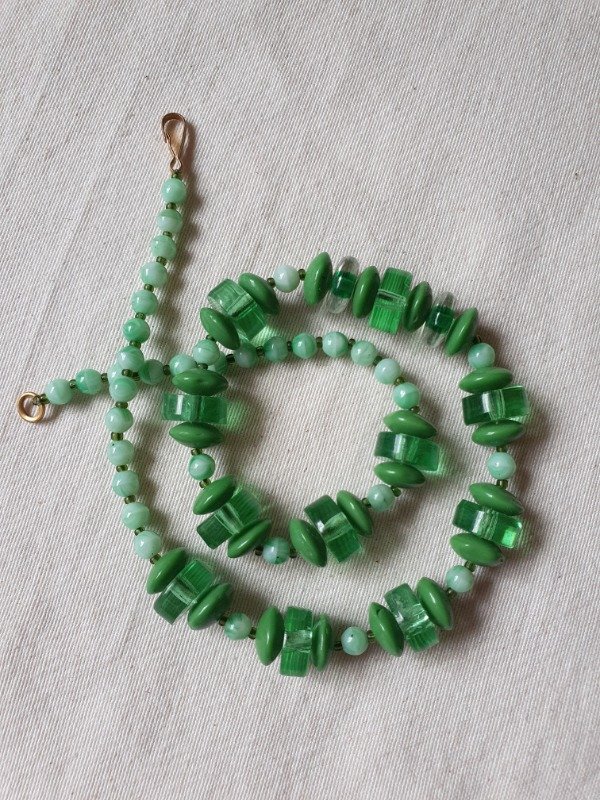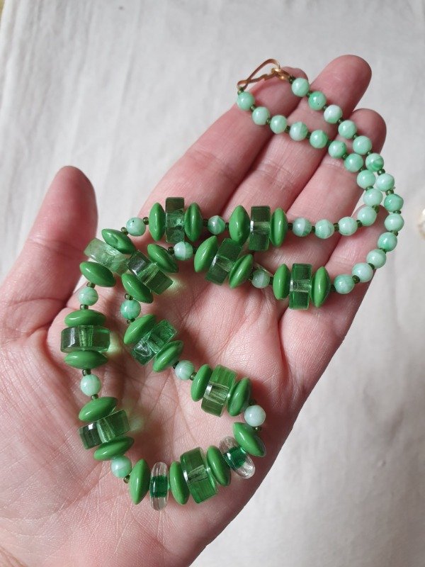 Gargantilla Art Déco 20s-40s de cristales geométricos (discos) en tono verde transparente, combinados con pequeñas perlas de Peking glass. Cortito, muy original e ideal para matchear con estos aros. Mide 40 cm de longitud y cierra con ganchito dorado