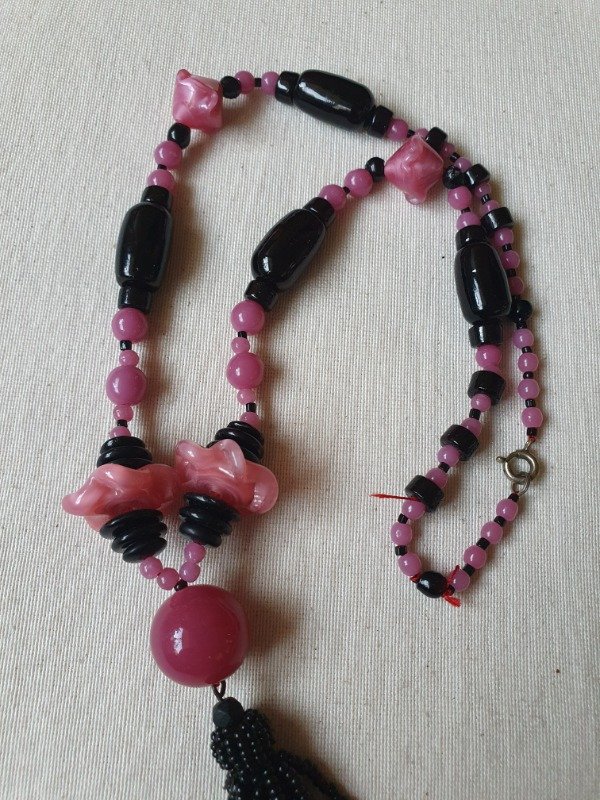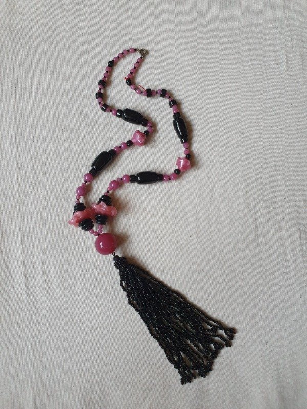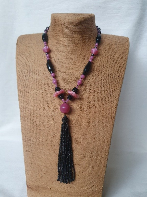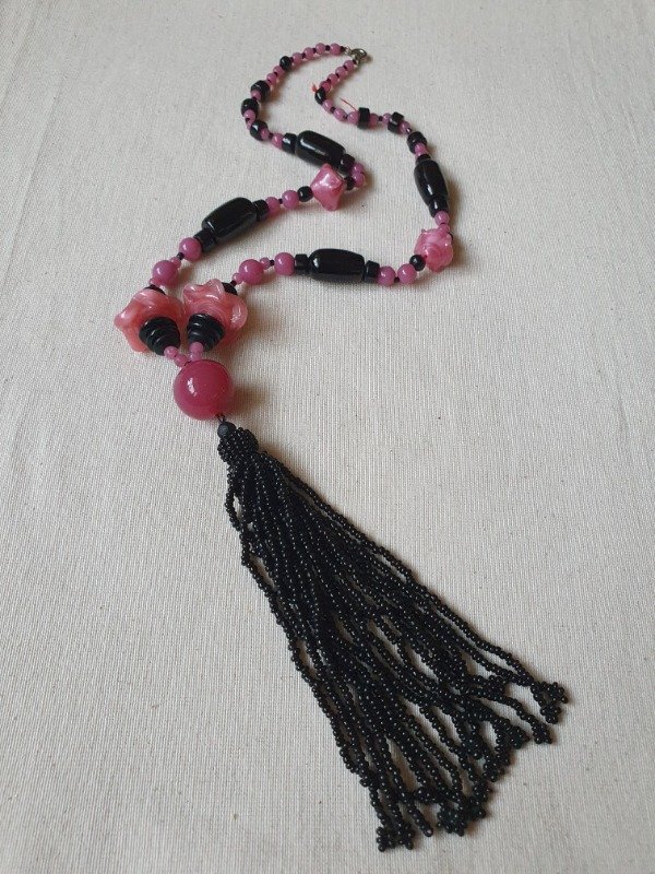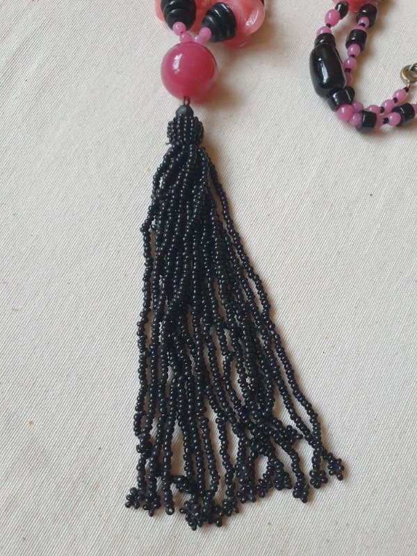 Está realizado con una variedad de cuentas de cristal en rosado y negro brillante.