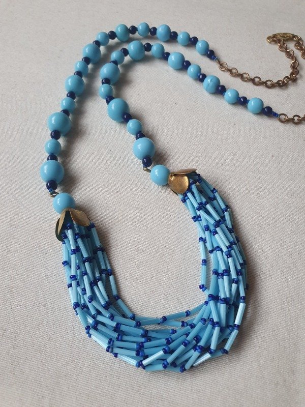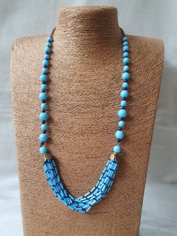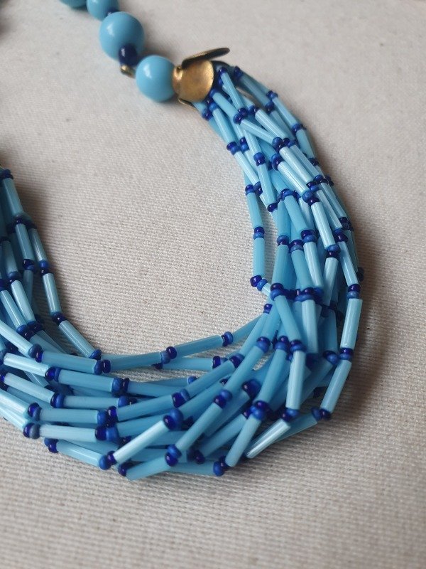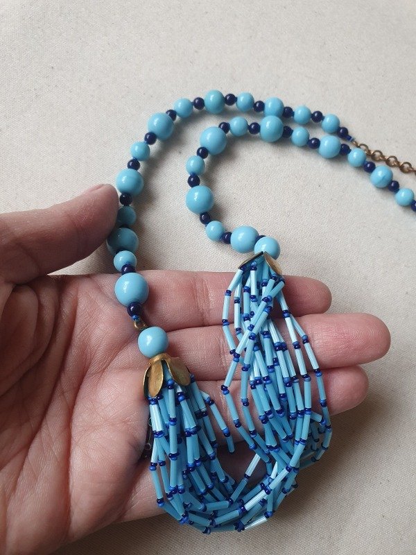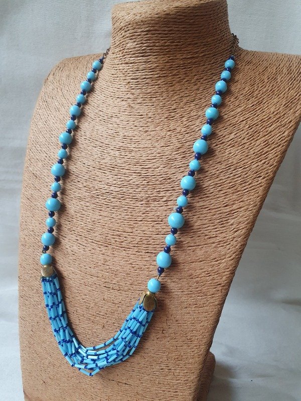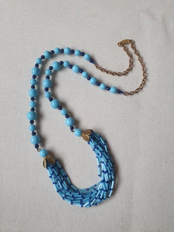 Collar de flapper años 20s-30s, estilo Egyptian revival, realizado con una variedad de cuentas de cristal de perlas de opalina en tonos celestes y azulados, enhebradas en cadena de alambre.