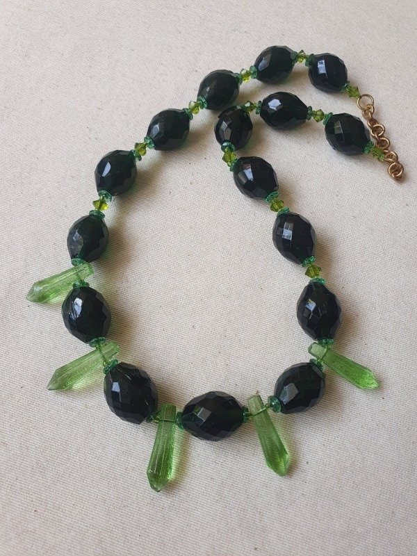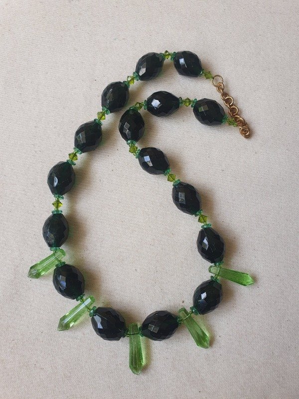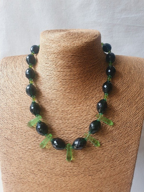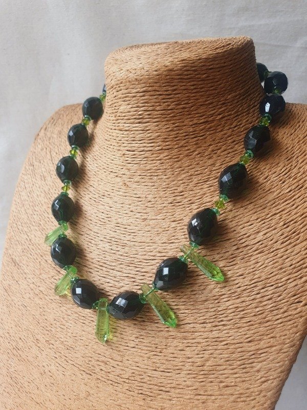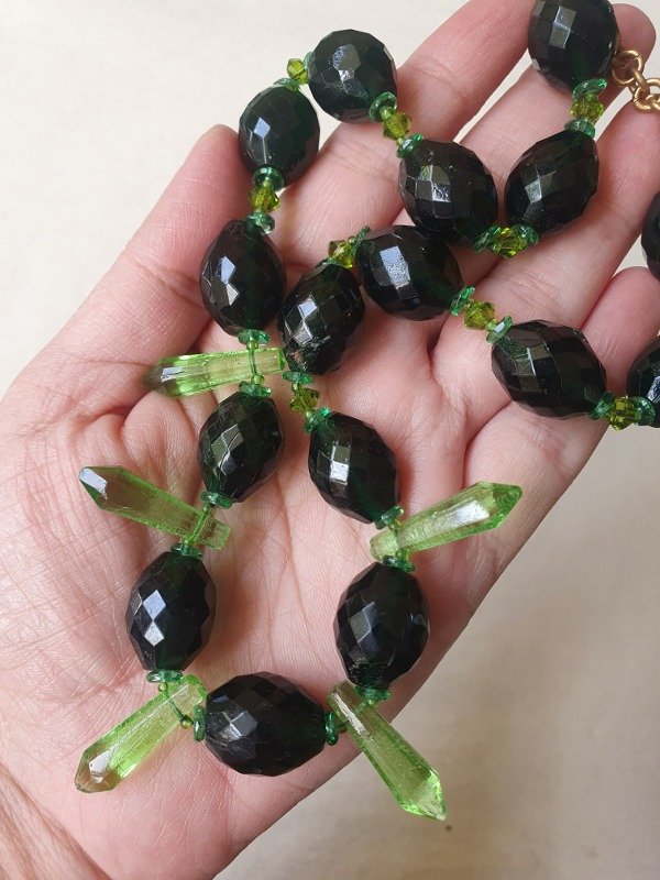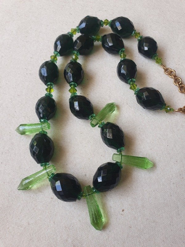 Collar de los años 20s-30s, realizado con una variedad de cuentas de cristal de diversas formas geométricas, muy propias del estilo Art Déco. Se destacan unas cuentas con formas alargadas y geométricas como las estalactitas. En tonos verde inglés muy oscuro y verdes más claros.