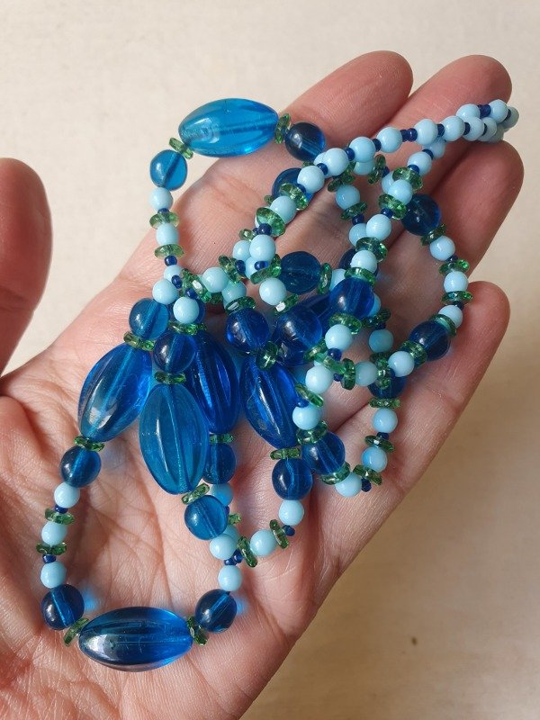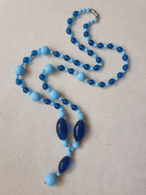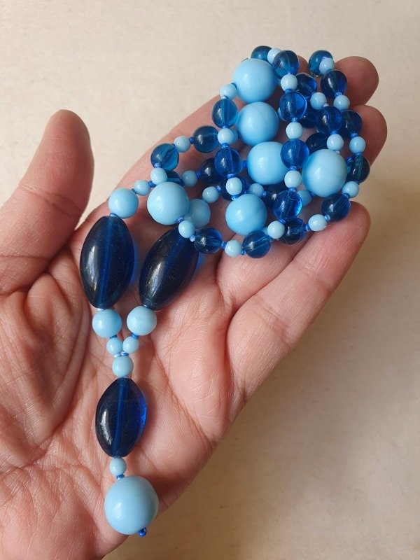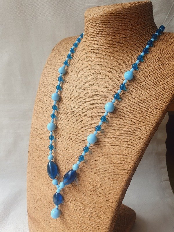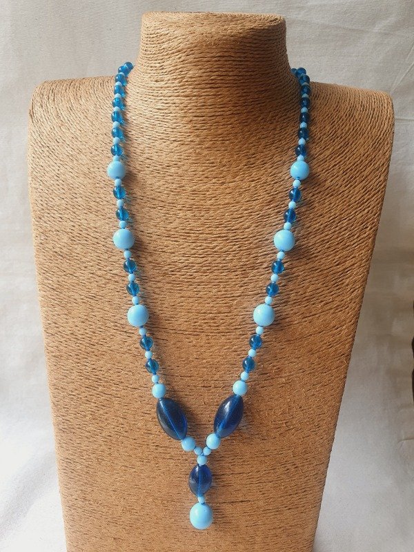Collar de flapper años 20s-30s, modelo lariat, realizado con una variedad de cuentas de cristal de diversas formas geométricas, muy propias del estilo Art Déco. En tonos turquesa y celeste Napoleón, termina en gota de cristal.