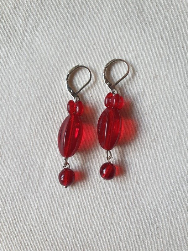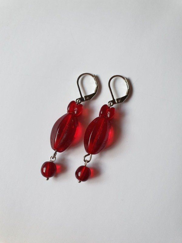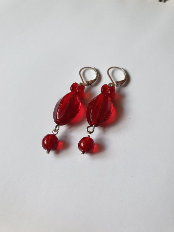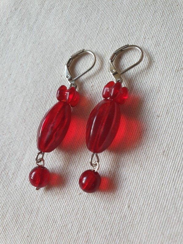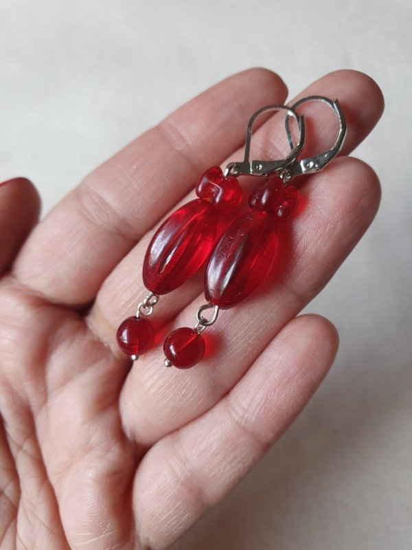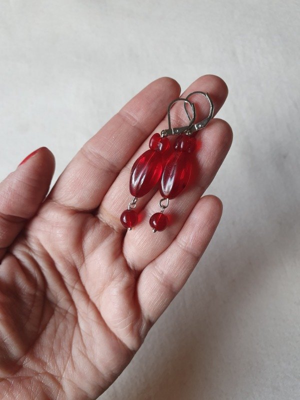 Aros colgantes realizados con cuentas de cristal vintage y antiguas recuperadas en tono rojo brillante. Cuentas de cristal Art Déco. Miden 4 cm y las bases son pasantes con gancho de metal plateado.