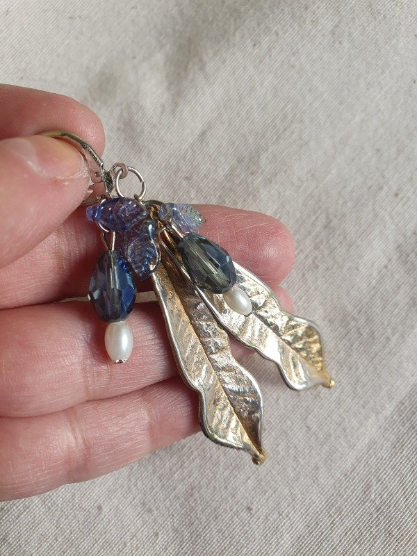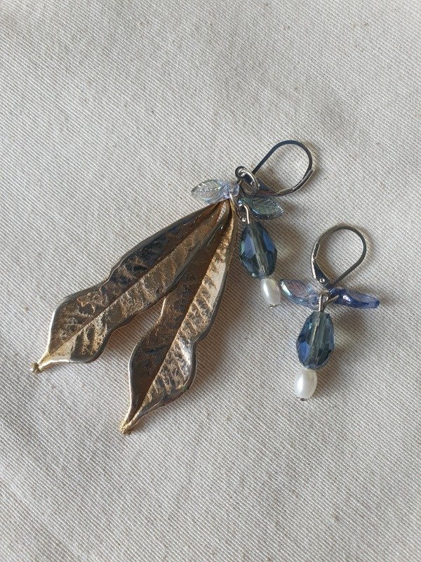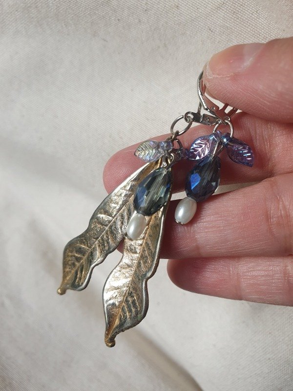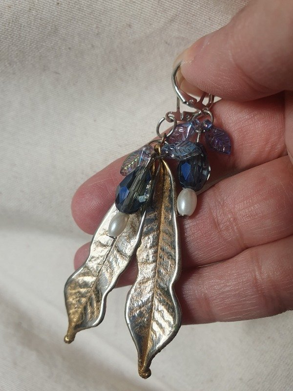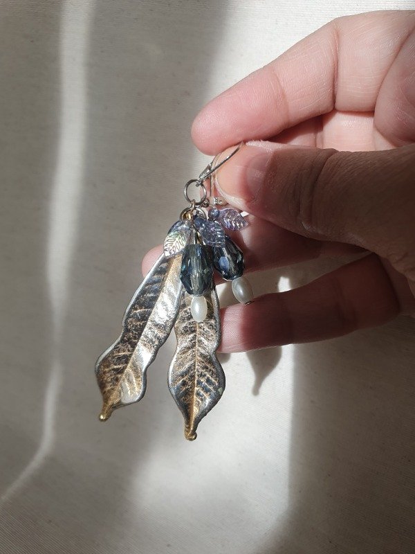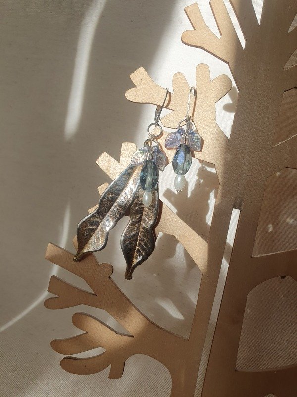 Aros colgantes realizados con materiales vintage recuperados. Los dos aros del par son diferentes, pero sus componentes combinan entre sí en estilo y paleta. Un aro es largo, tipo shoulder duster, con unas hojas plateadas recuperadas, gotas de cristal y hojitas y mide 6 cm de longitud promedio y el otro, más corto, es de 3 cm aproximadamente. Pasantes de metal dorado.