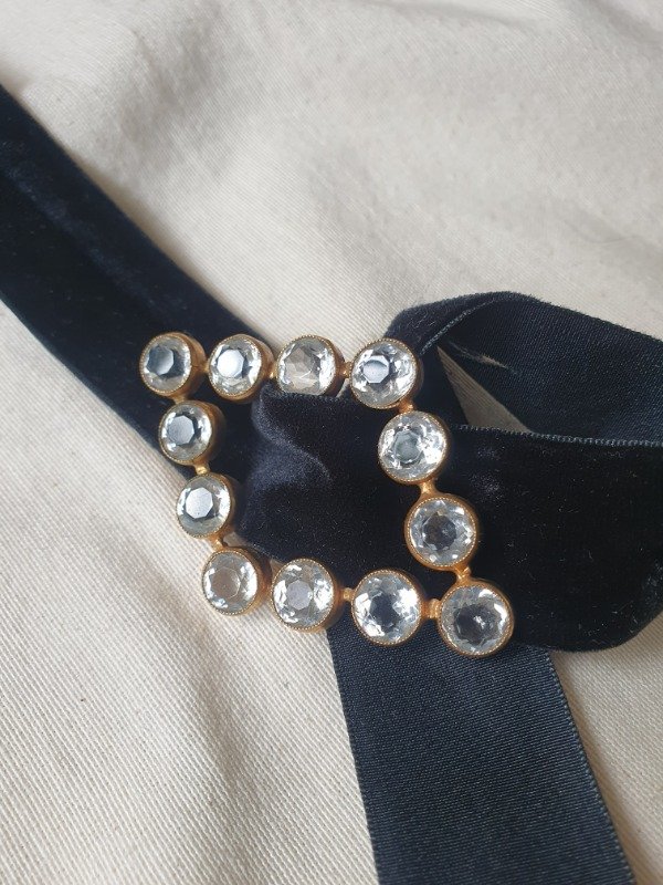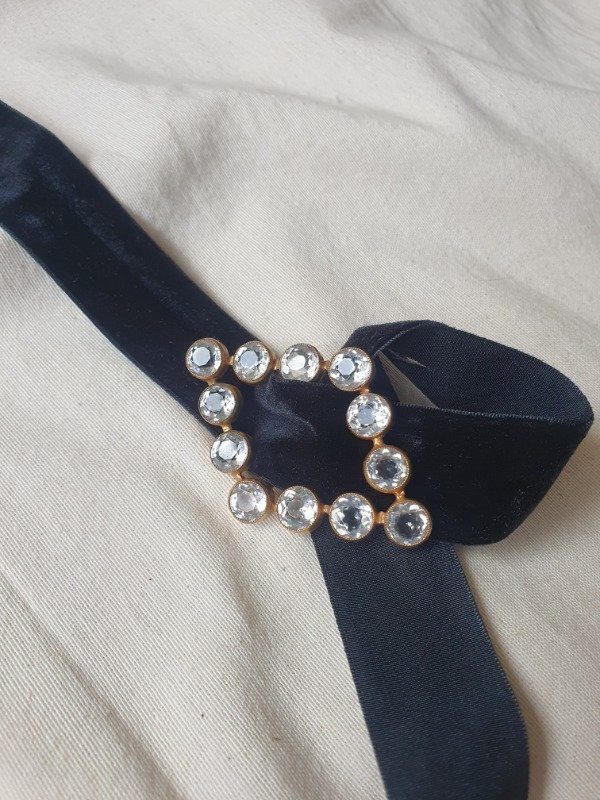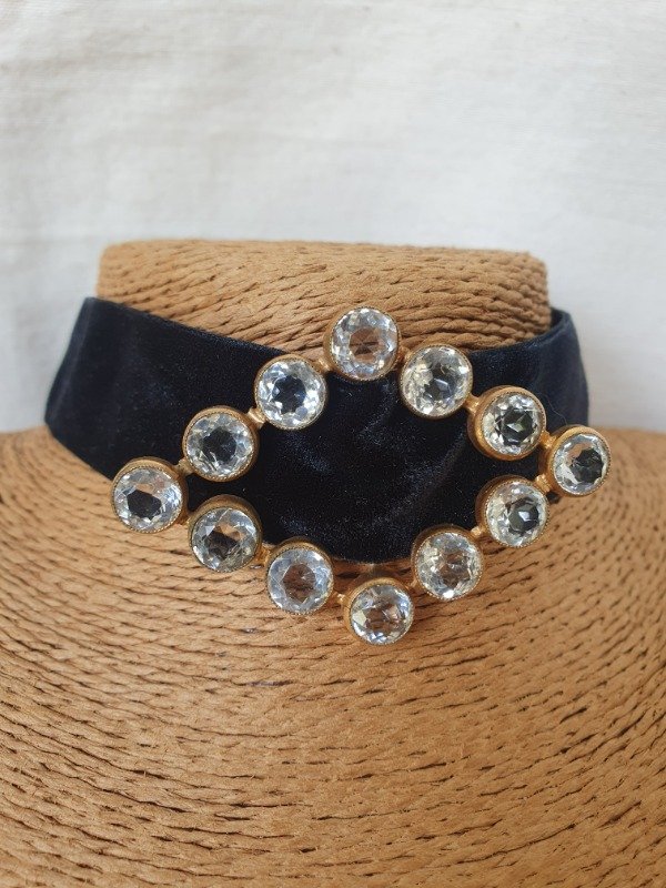 Esta hebilla antiguas de principios de siglo pasado de zafiro blanco ultra facetado es la protagonistas de la gargantilla de cinta de terciopelo negro que se anuda al cuello con un moño o lazo. Mide 6 cm x 4 cm y tiene base dorada.