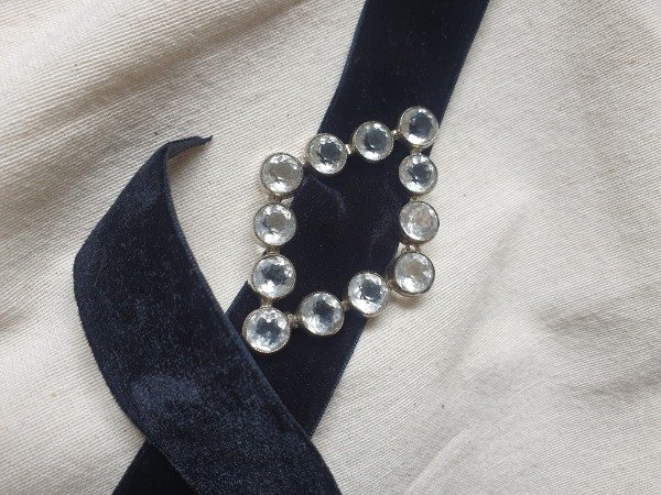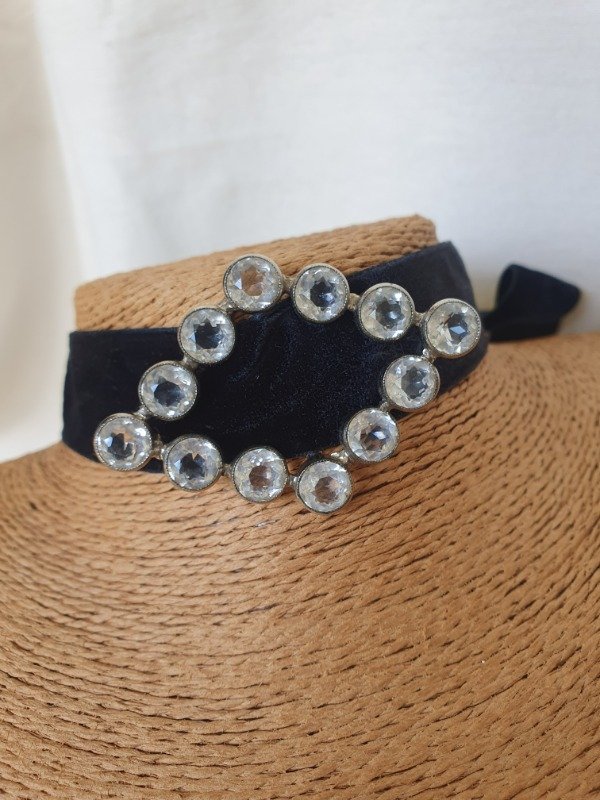 Esta hebilla antiguas de principios de siglo pasado de zafiro blanco ultra facetado es la protagonistas de la gargantilla de cinta de terciopelo negro que se anuda al cuello con un moño o lazo. Mide 6 cm x 4 cm y tiene base plateada.