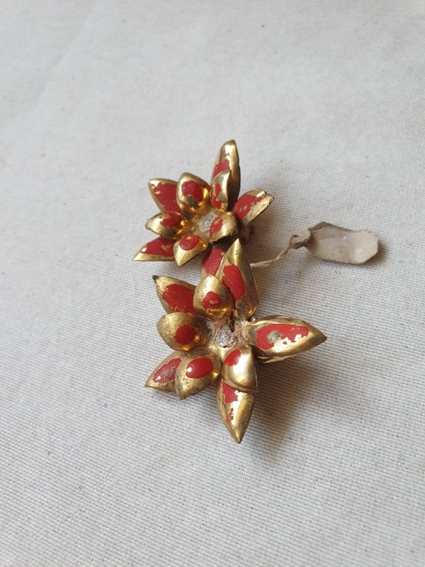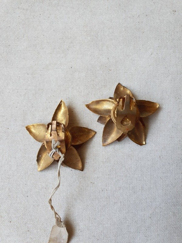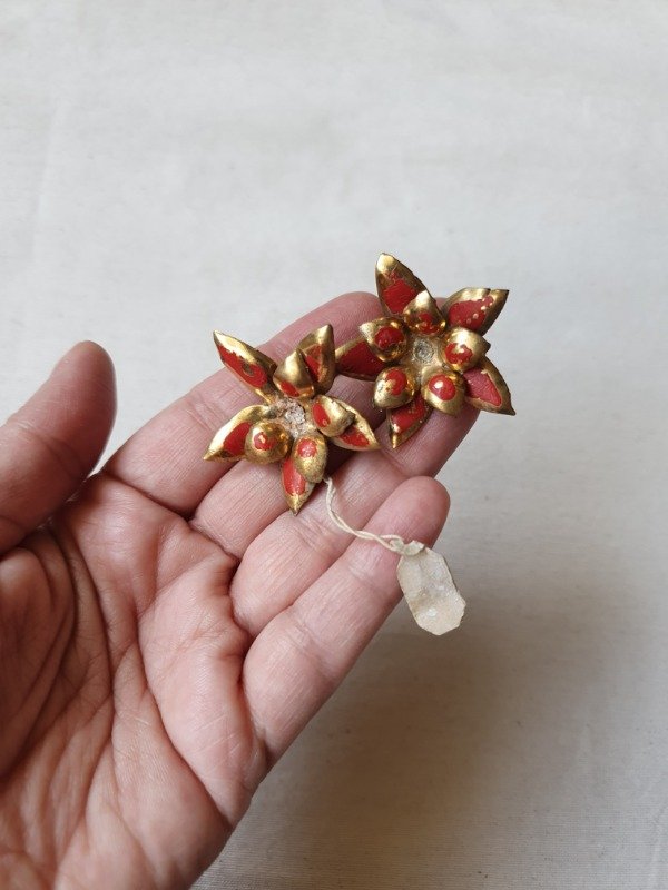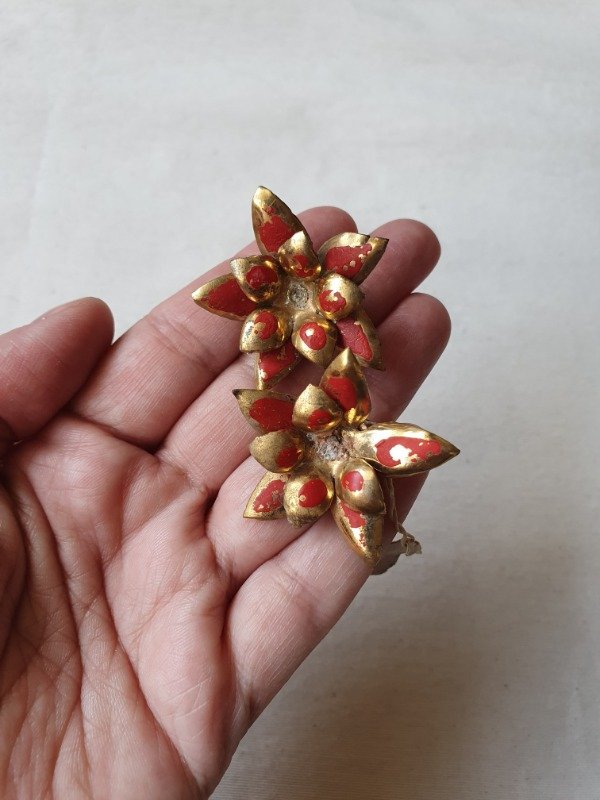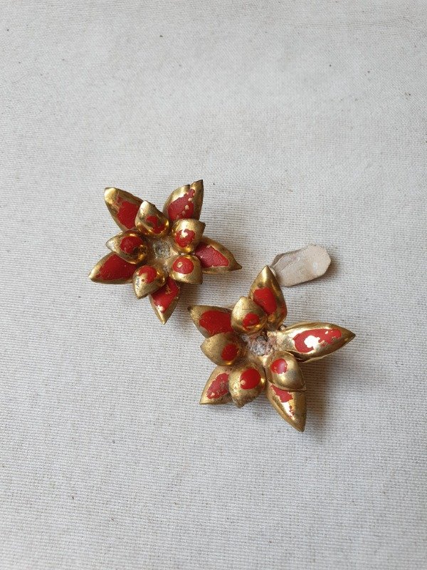 Aros clips checos de los años 40s diseño de flor pinchuda en dos niveles con pétalos de bronce esmaltados en rojo. El sistema de clip es comodísimo. Miden 3,5 cm de diámetro y son voluminosos