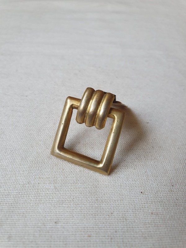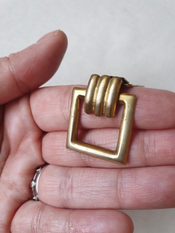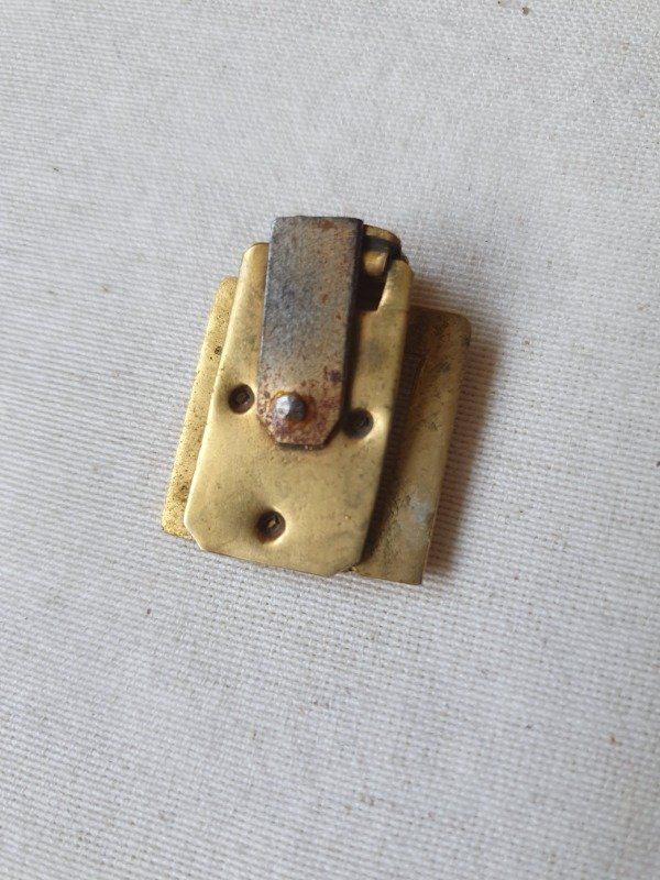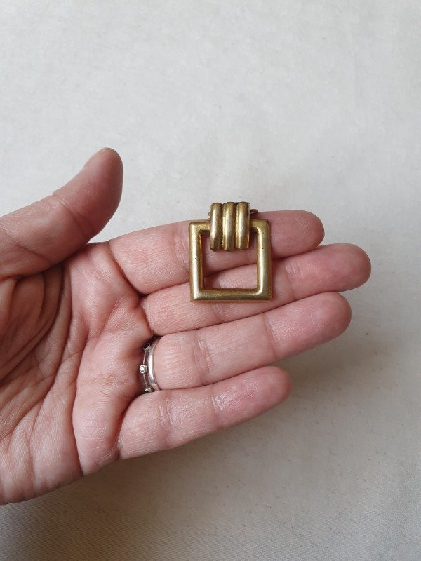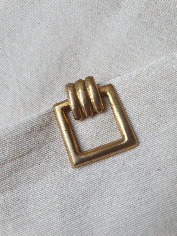 Clip de vestido años 30s~40s, con forma de marco cuadrado, en bronce, con detalle de traba ondulada y, al ser calado, deja traslucir la prenda sobre la que está abrochado. Mide 2,2 cm de lado y, en el dorso tiene un clip con ganchitos que se sujetan a las prendas.