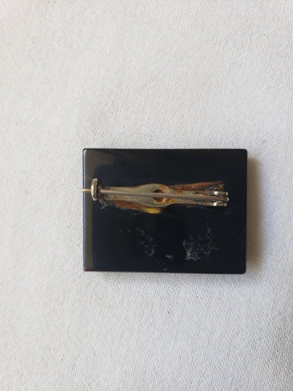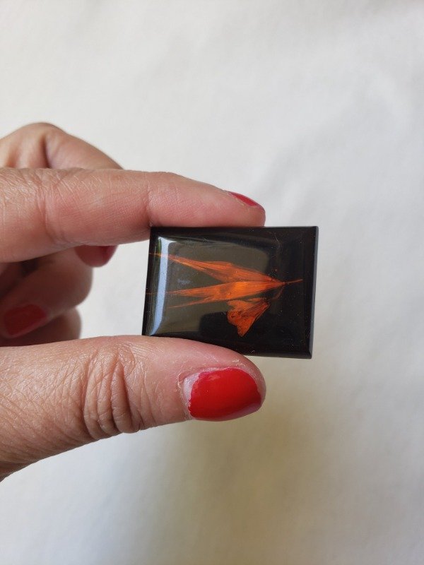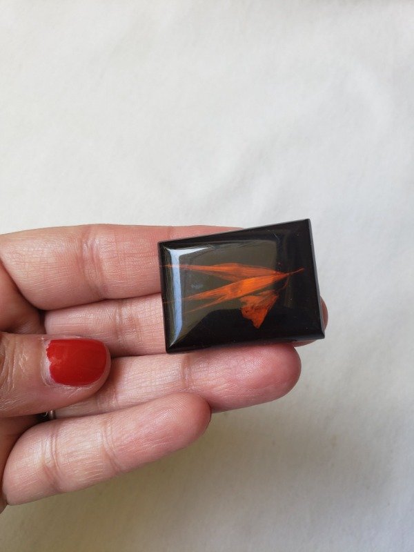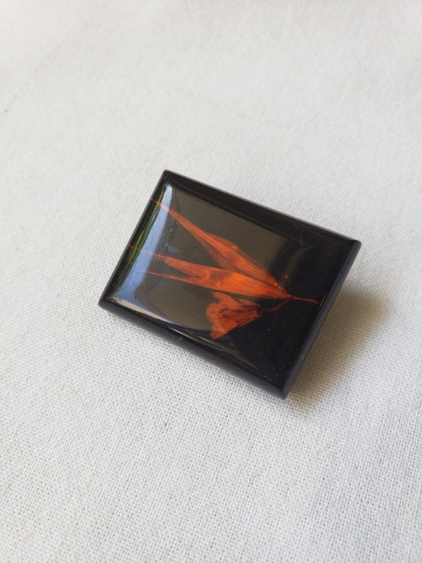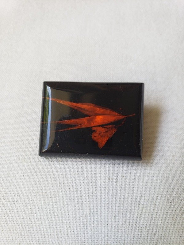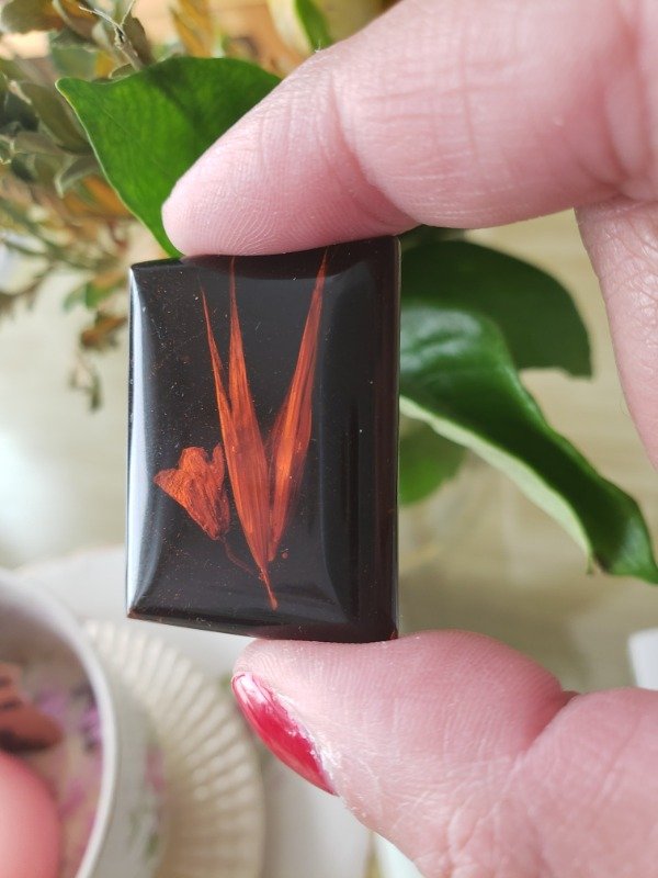 Brochecito Art Déco de lucita tortoiseshell transparente, cuadrado, con los bordes redondeados y un brillo increíble. Encerradas en la lucita, una ramita y una flor secas. Una preciosura, ultra delicada y combinable. Mide 3 cm x 2,2 cm