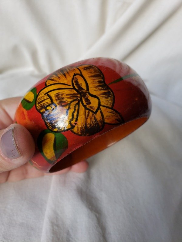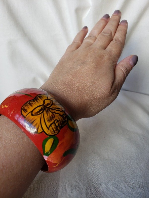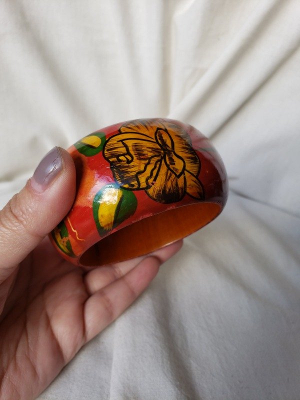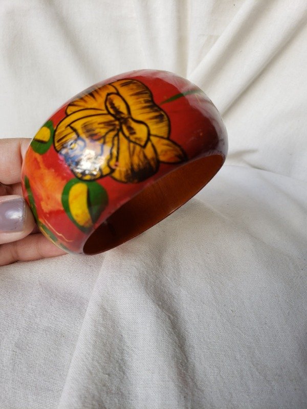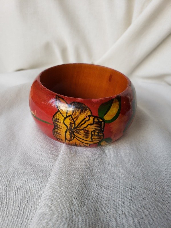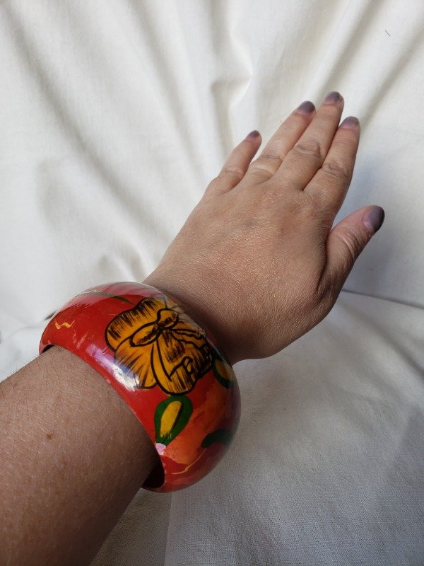 De madera laqueada en tonos rojizos, coral, azafrán y verdes, con motivos florales