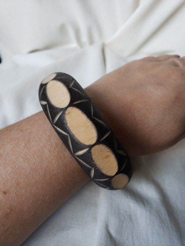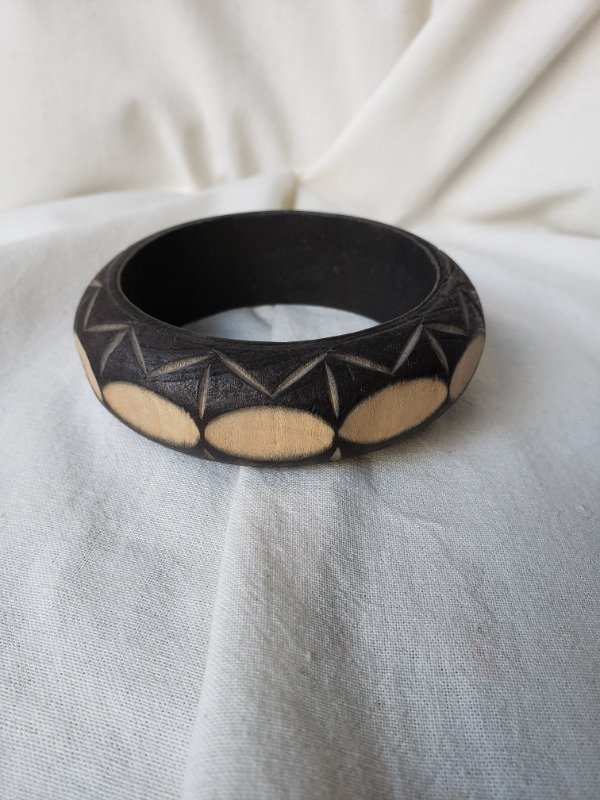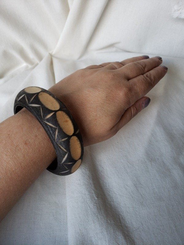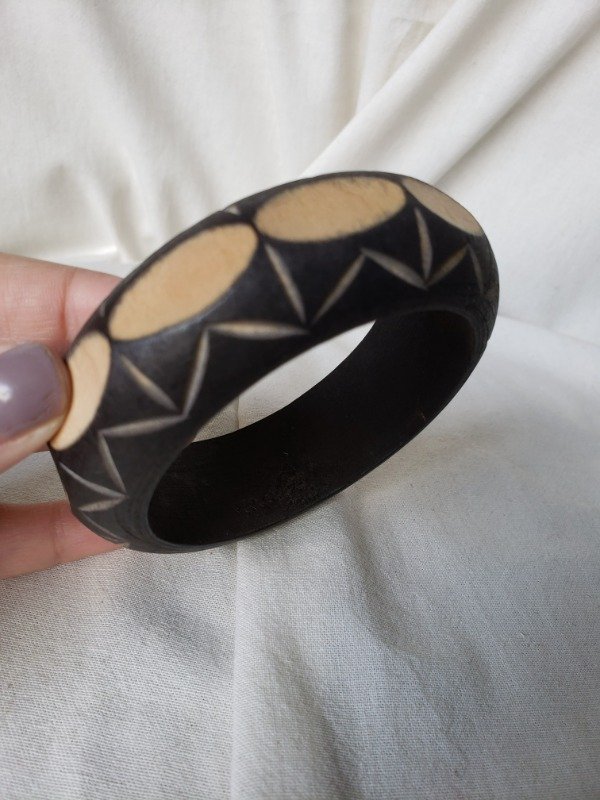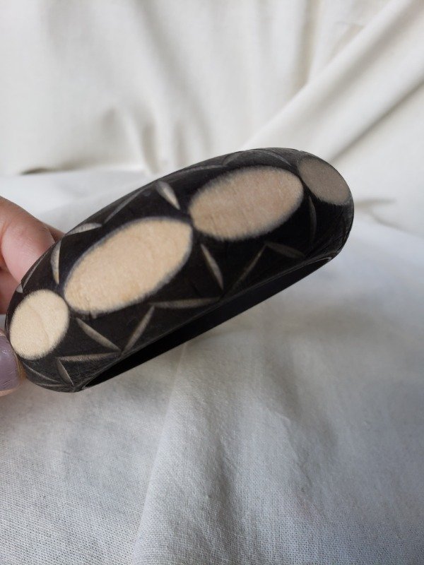 Pulsera vintage de madera tallada, ancho medio, color marrón oscuro y tonos de la madera cruda, con diseños étnicos